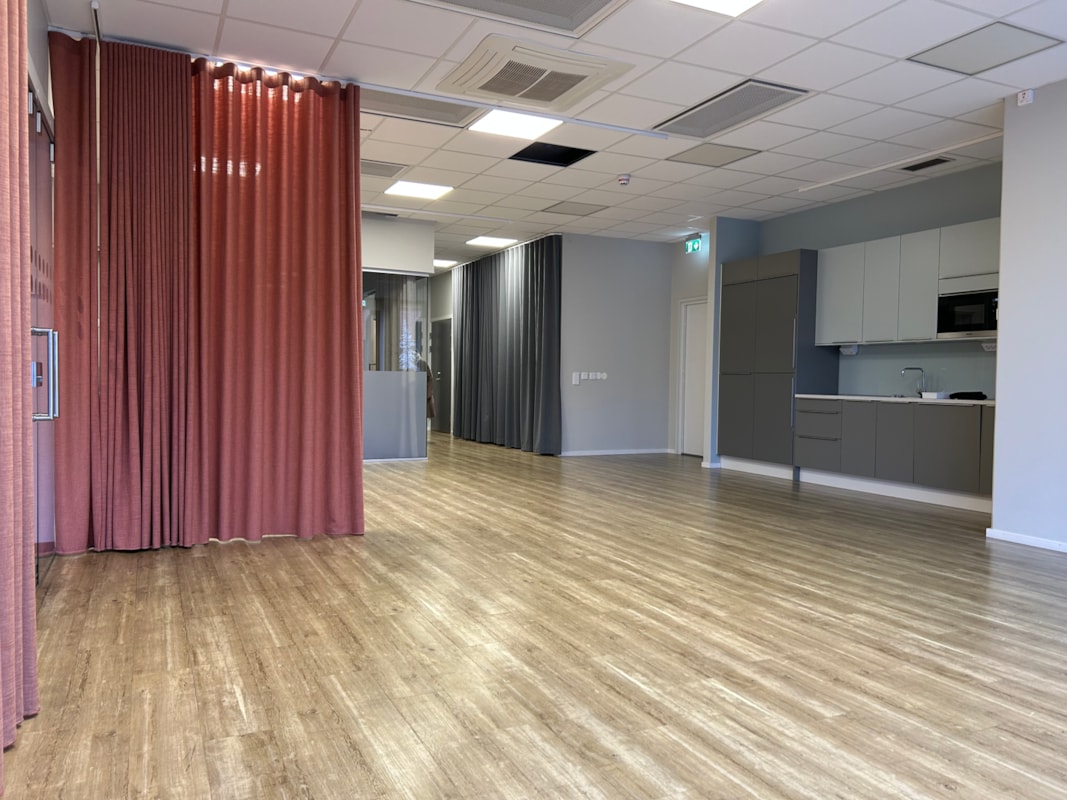 Lokalen har en öppen planlösning som lockar till kreaktivitet och har många möjligheter. Lokalen har högt i tak vilket ger en luftig och härlig känsla med en fin park utanför de stora fönstren. Ljusa materialval och glaspartier.