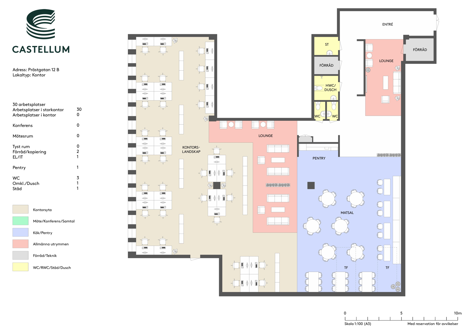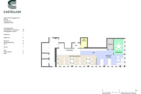 Med generösa 472 kvm finns goda möjligheter att skapa olika zoner och arbetsområden anpassade efter verksamhetens behov. Lokalen lämpar sig väl för både öppna och kollaborativa ytor för teamarbete och kreativa möten, samtidigt som privata kontorsrum eller avskilda arbetsplatser kan inrättas för koncentrationskrävande uppgifter.