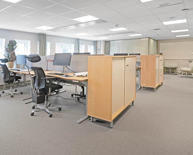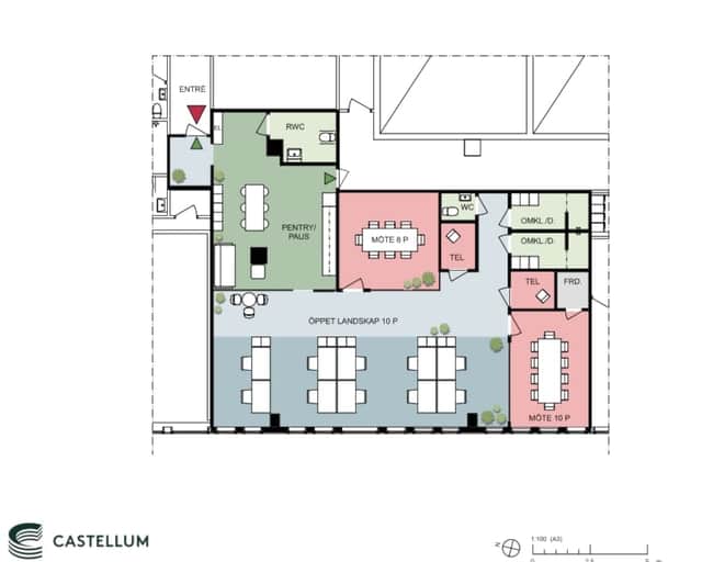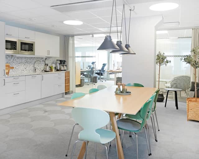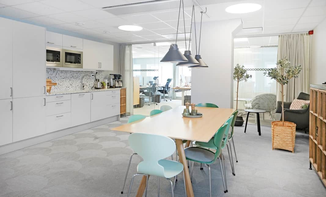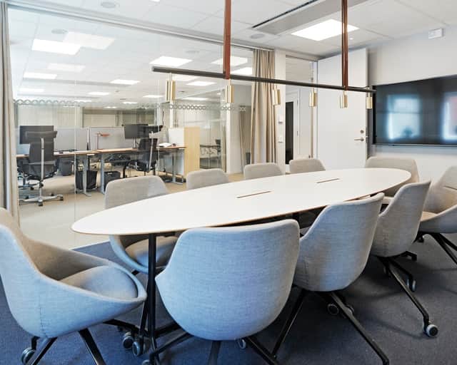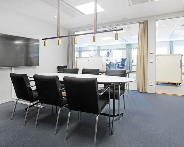 Lokalen har en modern planlösning. Plats för både arbetsplatser, mötesrum och sociala ytor - allt man kan tänkas behöva.