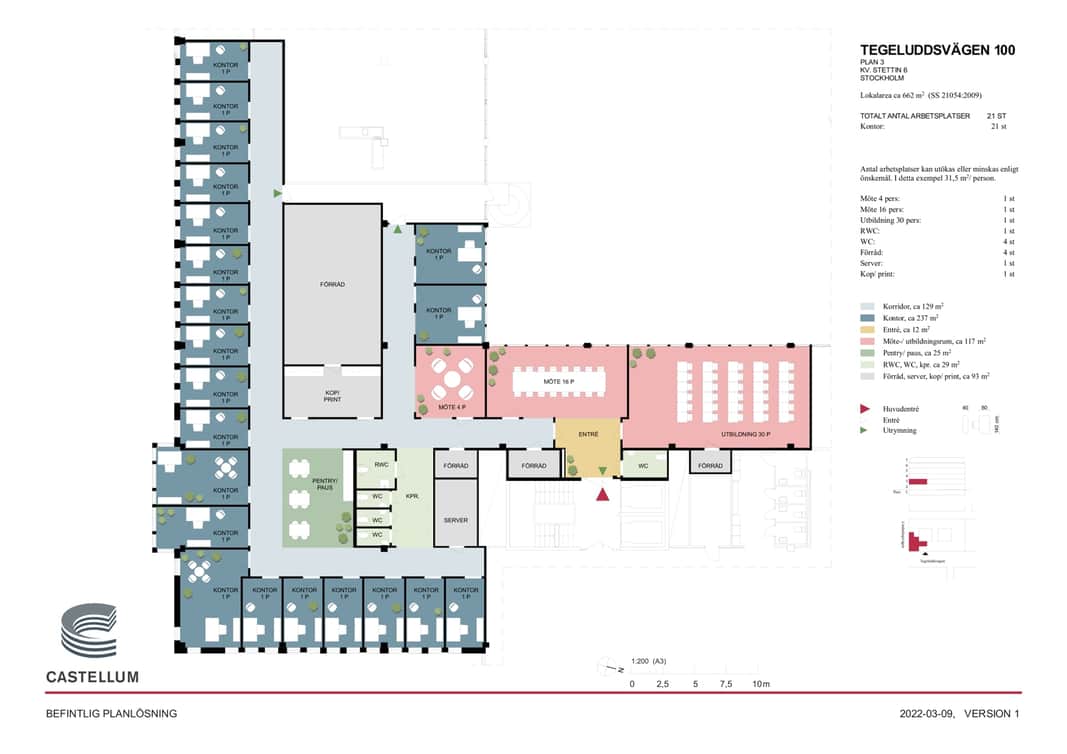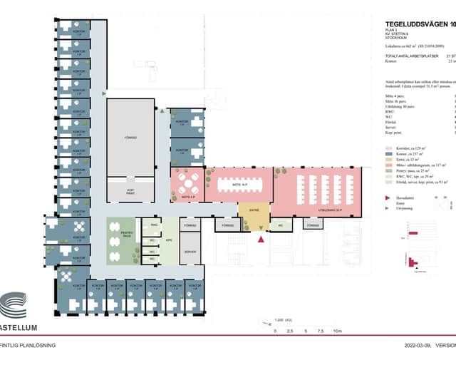 Lokalens planlösning idag består av enskilda kontorsrum, mötesrum i olika storlekar, personalytor, utbildningssal och förrådsytor. Lokalens layout går enkelt anpassa efter era behov.
