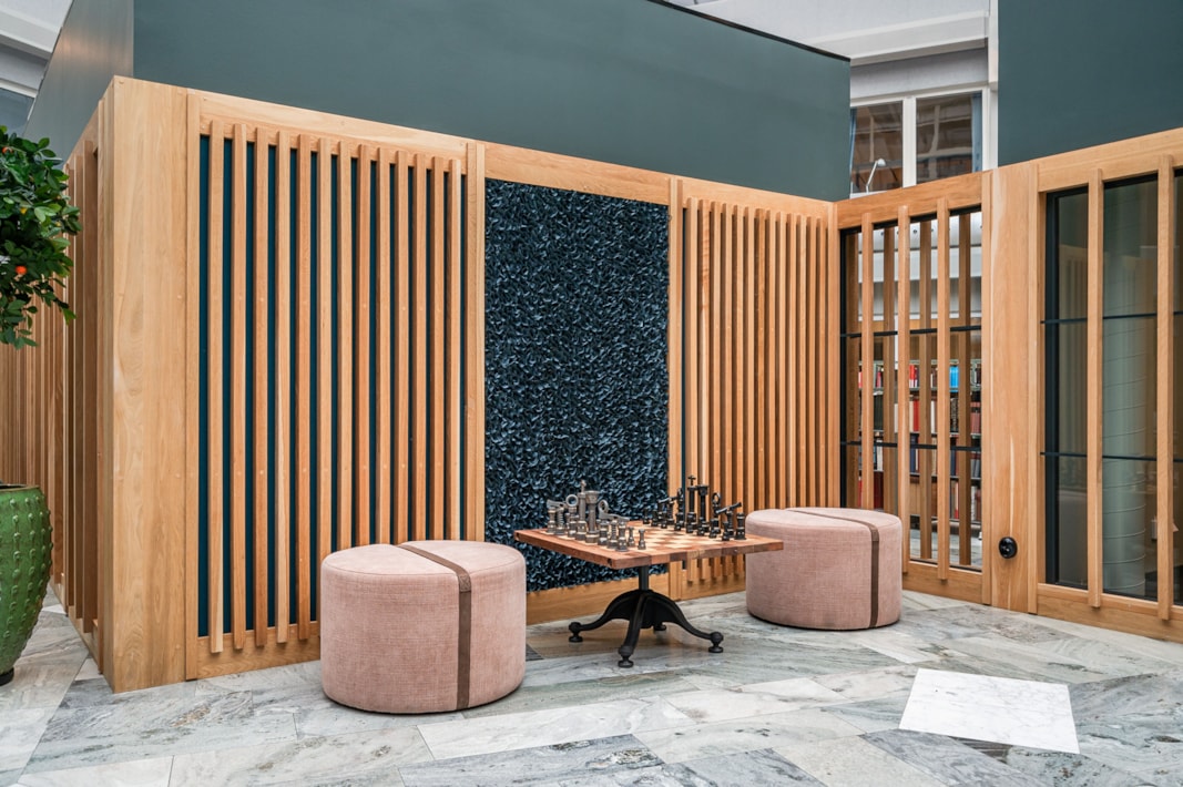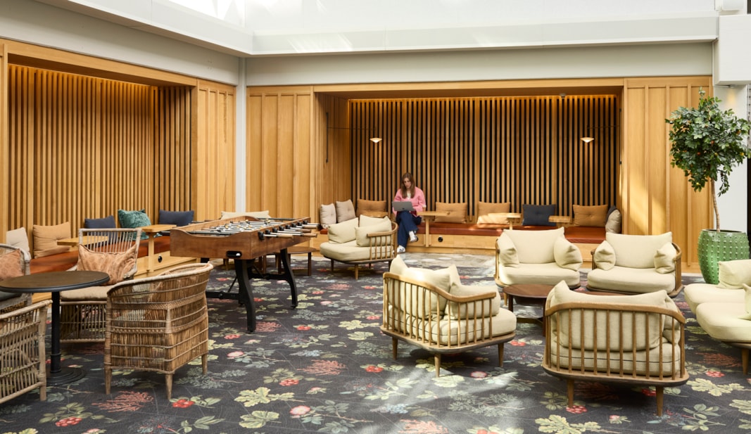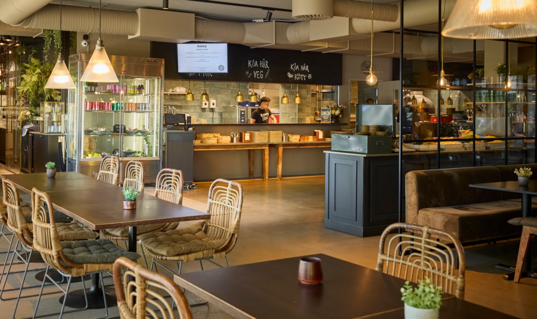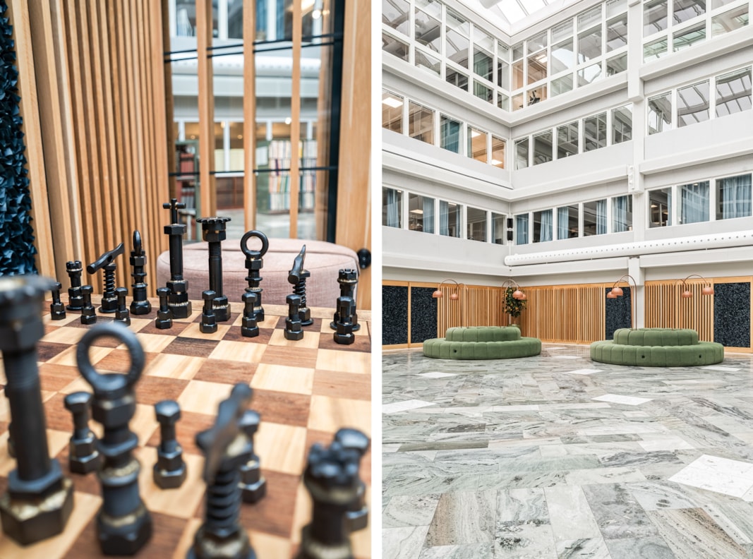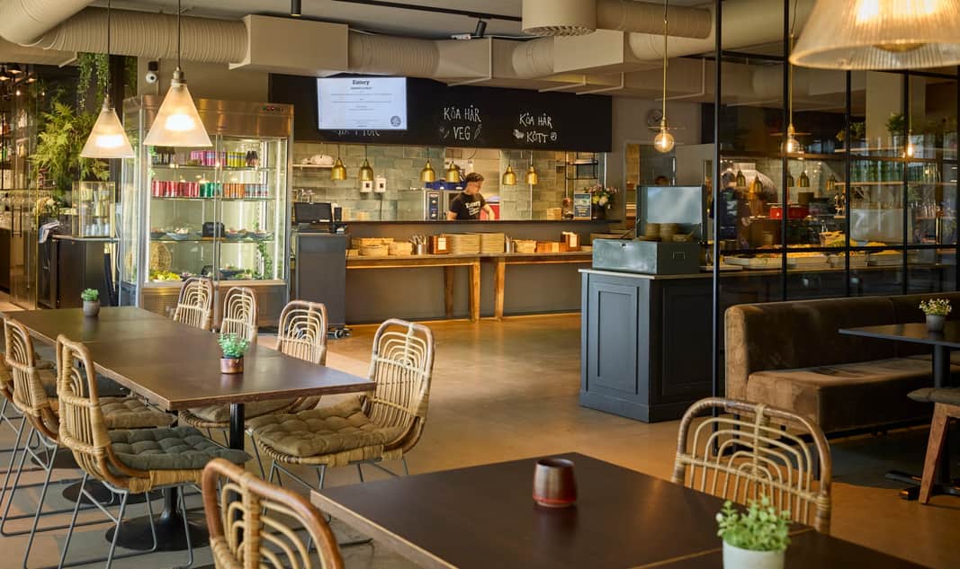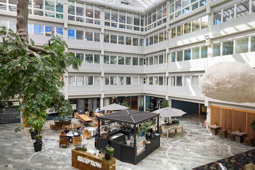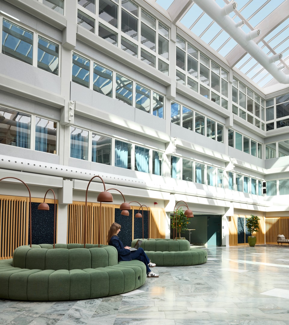 Här möts ni av en härlig ljusgård med högt i tak, fint ljusinsläpp, receptionsdisk, soffgrupper att avnjuta en kaffe i från Eaterys kaffehörna, spel och en avkopplande miljö.
