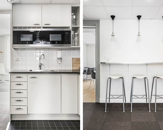 Lokalen erbjuder två stora konferensrum som tidigare använts för utbildningar, samt två mindre kontorsrum. Direkt i anslutning från trapphuset kommer man till husets egna innergård.