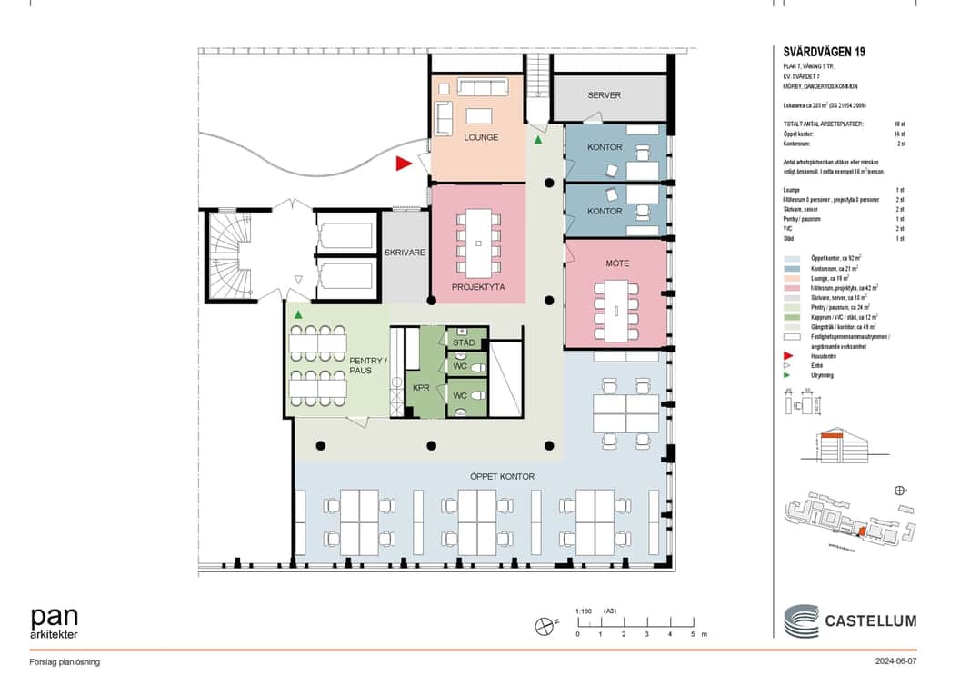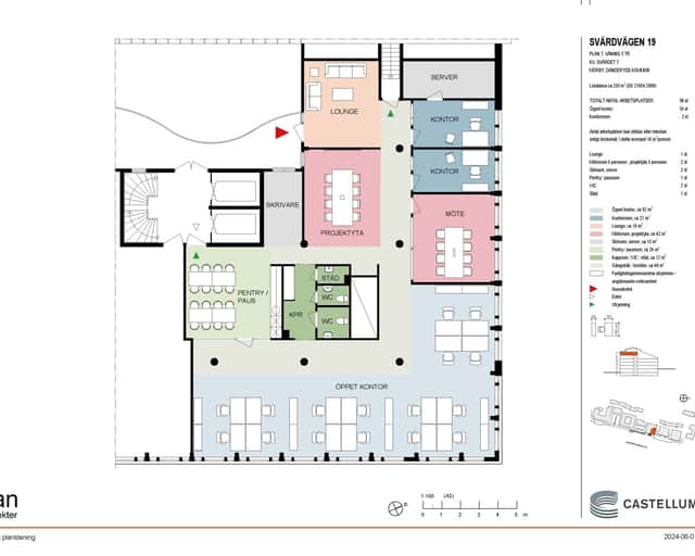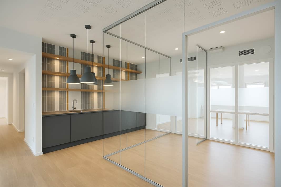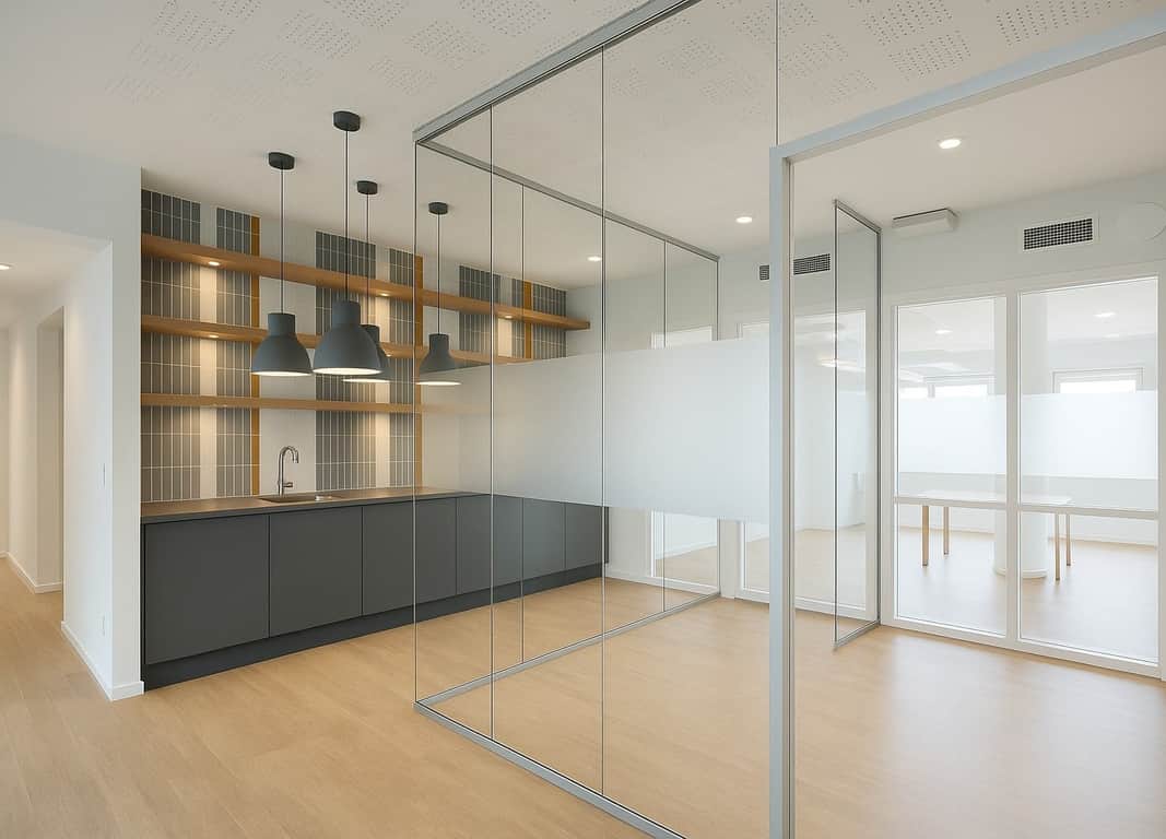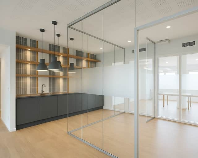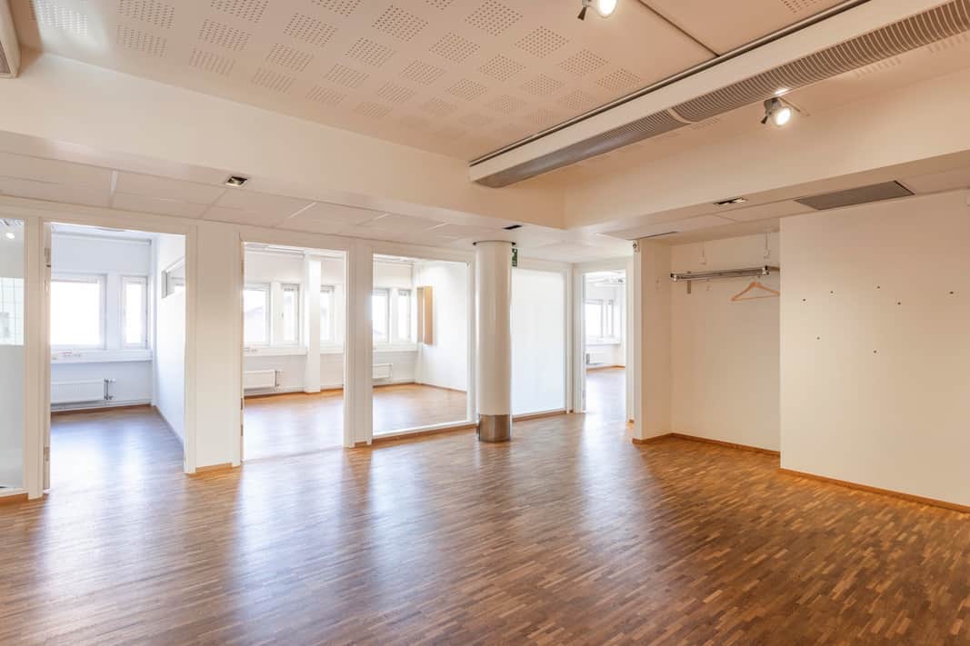 Öppen planlösning i kombination med konferens- och mötesrum.