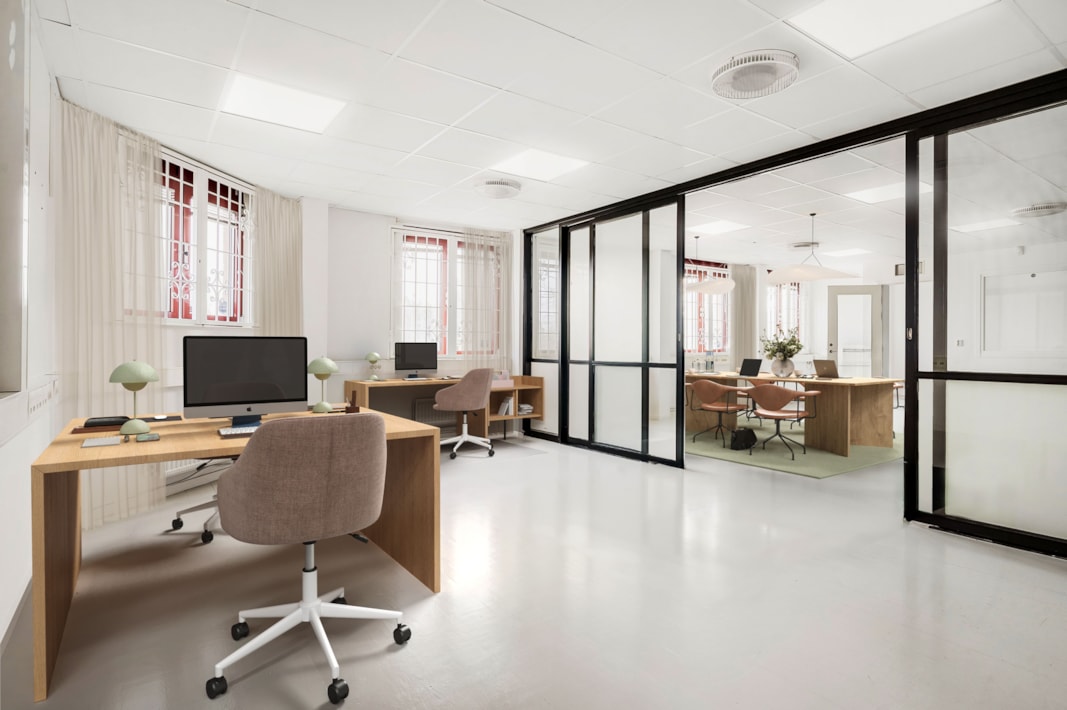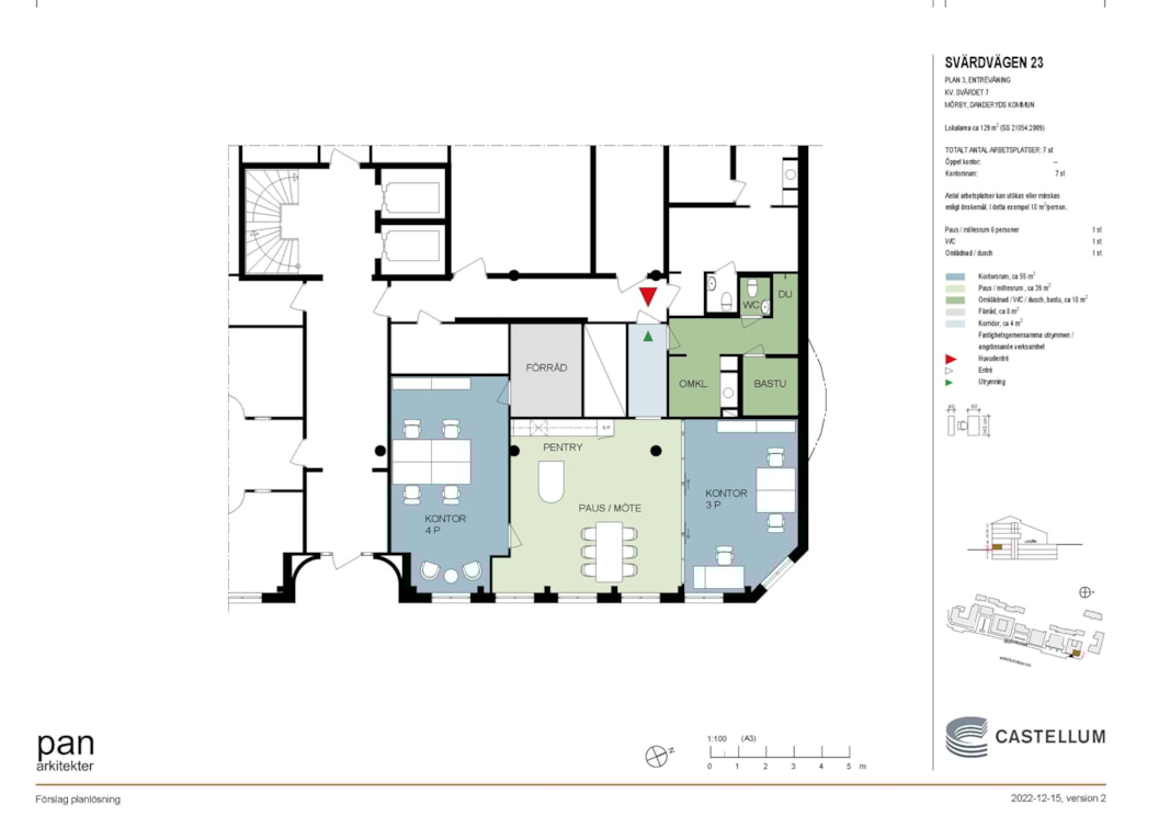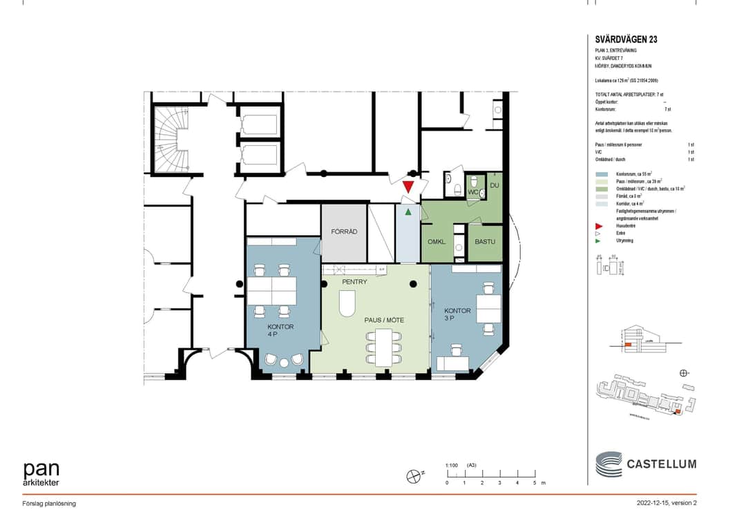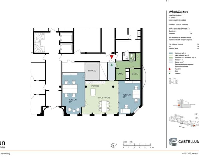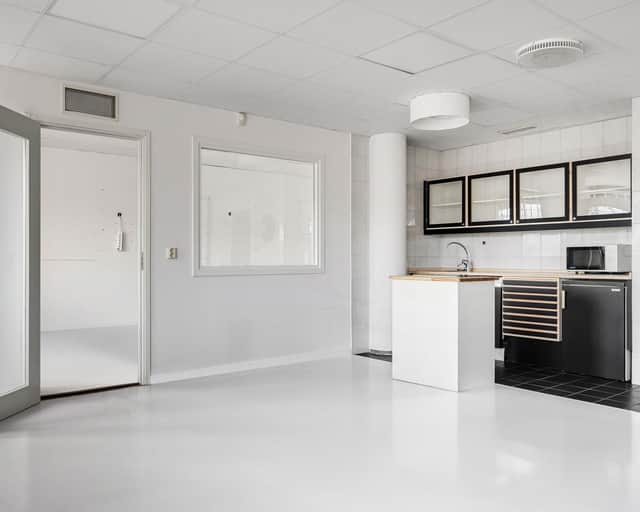 Kontoret är beläget på entréplan och har öppen planlösning samt dubbla säkerhetsdörrar. I lokalen finns även dusch, bastu och omklädningsrum.