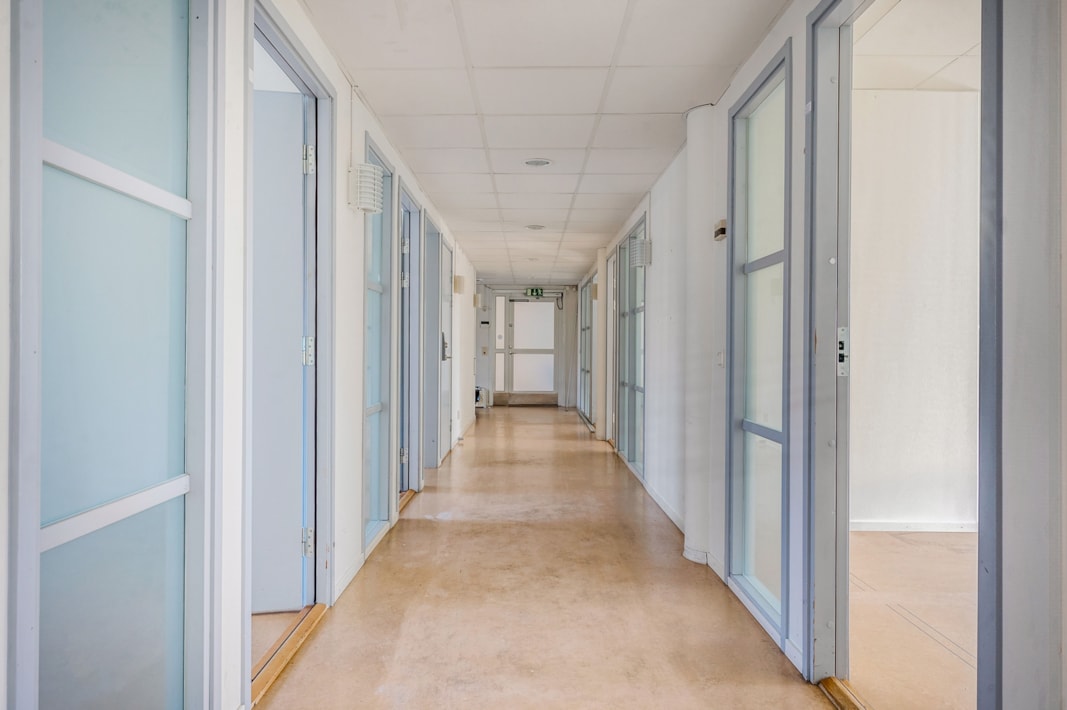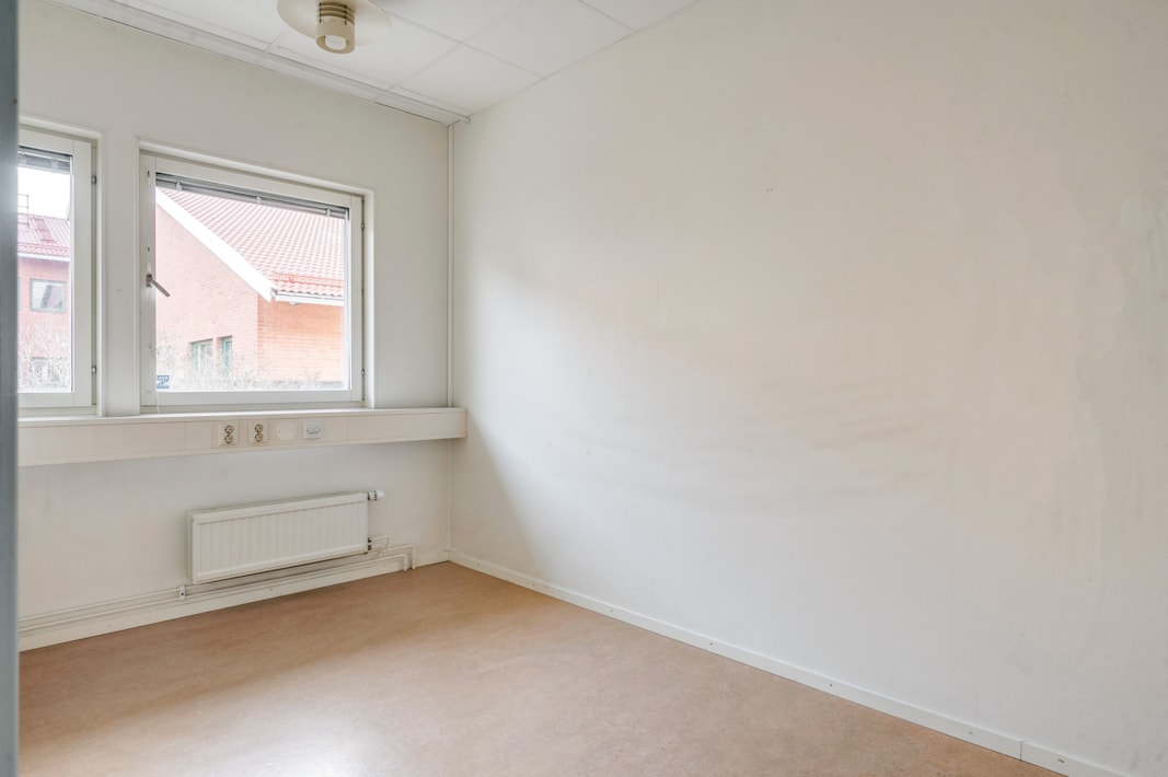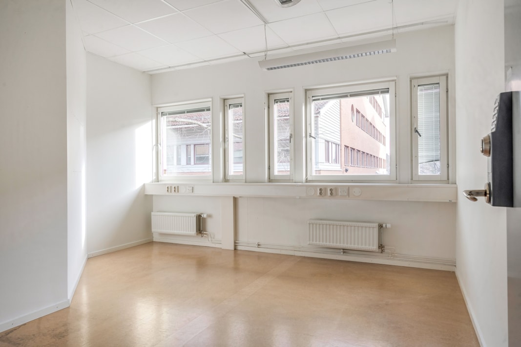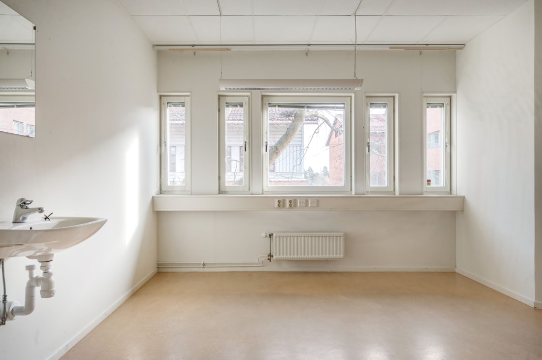 Kontoret är rumsindelad och i vissa rum finns det handfat installerade.