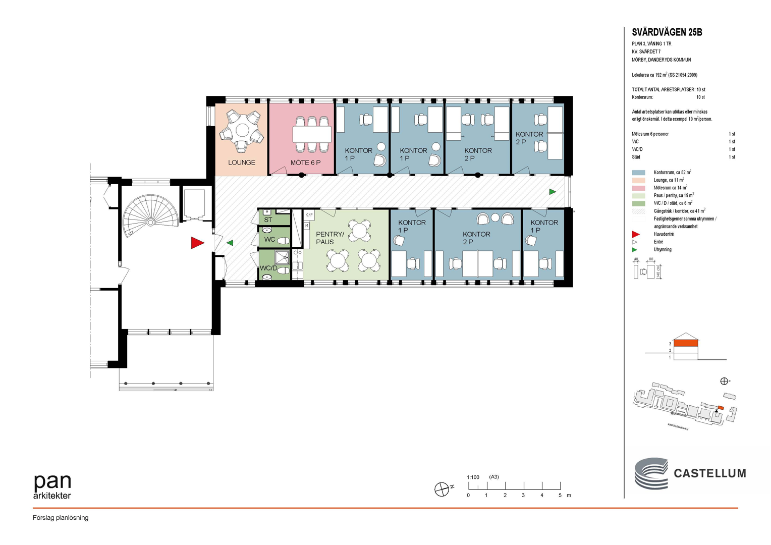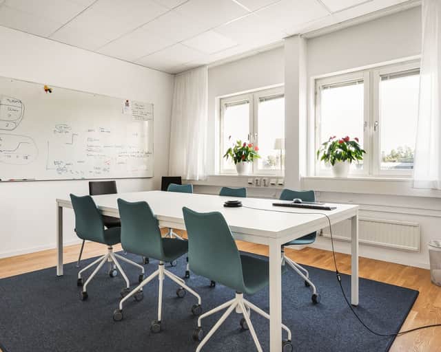 Lokalen är smart utformad med 10 kontorsrum, vilket ger plats för upp till 19 medarbetare. De olika kontorsrummen, tillsammans med ett rymligt mötesrum för sex personer, skapar en flexibel arbetsyta som kan anpassas efter era behov. Förutom arbetsplatserna finns även en trivsam lounge, perfekt för informella möten eller en paus från arbetet.