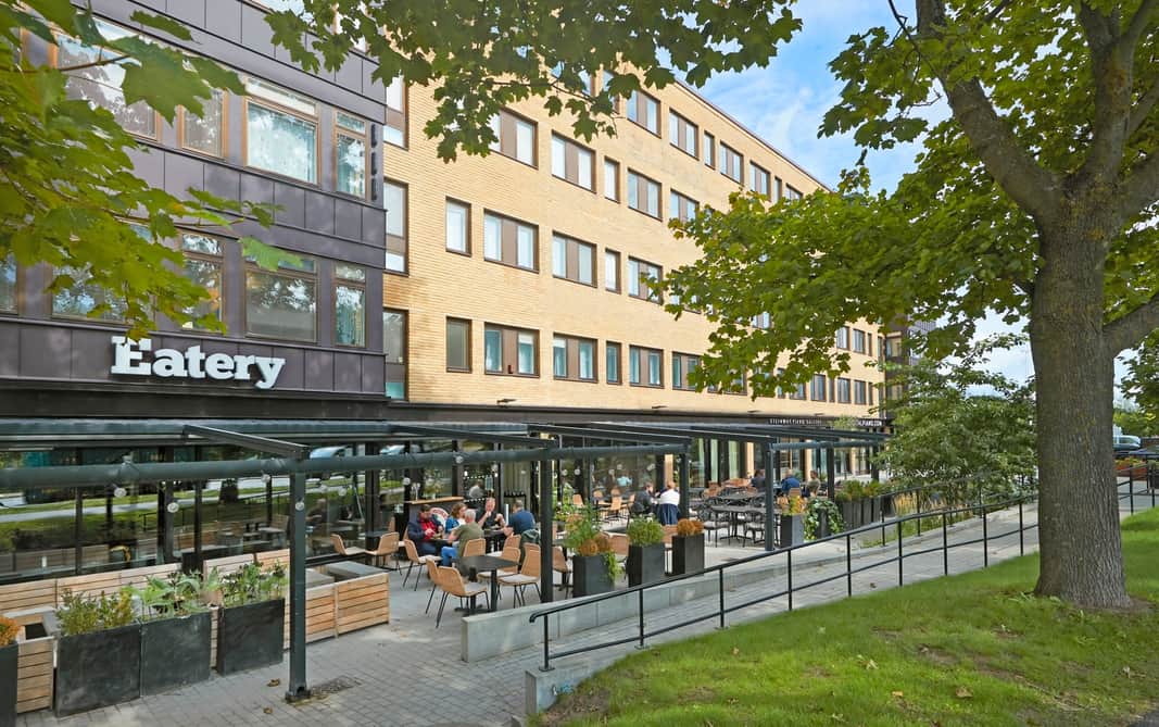 Precis utanför entrén breder ett charmigt, grönskande torg ut sig – en naturlig mötesplats med gemensamma sittbänkar i soligt läge. Här kan du ta en kaffe i solen, hålla informella möten utomhus eller bara njuta av en stunds avkoppling mellan arbetsuppgifterna.