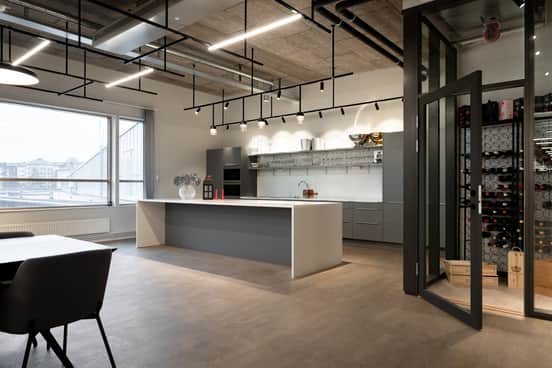 Lokalen har en modern och öppen planlösning. Plats för både arbetsplatser, mötesrum och sociala ytor - allt man kan tänkas behöva.