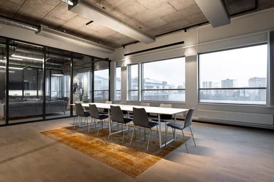 Vårt kontorslandskap erbjuder en öppen planlösning, två funktionella mötesrum och två avskilda samtalsrum för mer fokuserade diskussioner.