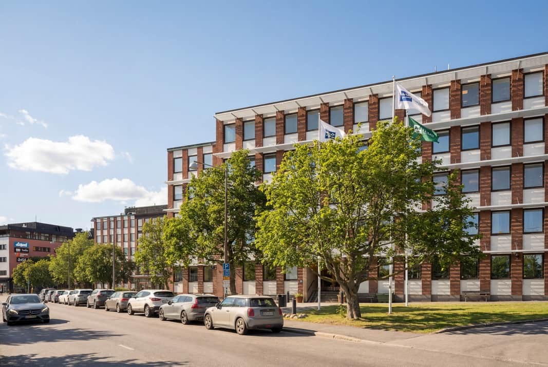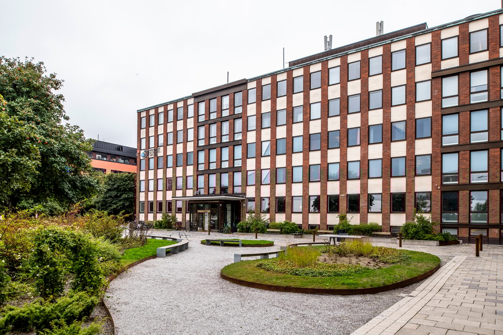 Precis utanför entrén breder ett charmigt, grönskande torg ut sig – en naturlig mötesplats med gemensamma sittbänkar i soligt läge. Här kan du ta en kaffe i solen, hålla informella möten utomhus eller bara njuta av en stunds avkoppling mellan arbetsuppgifterna.