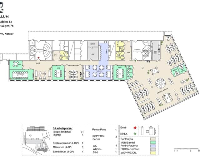 Planlösningen som är publiserad är ett förslag på utförande med majoriteten i öppet landskap, kompletterat med flera mötesrum, samtalsrum och en generös paus-/pentryyta centralt placerad. Entrén leder in till en välkomnande del med konferensrum och lounge, medan den större öppna kontorsdelen är placerad i den ljusa vinklade delen av lokalen.