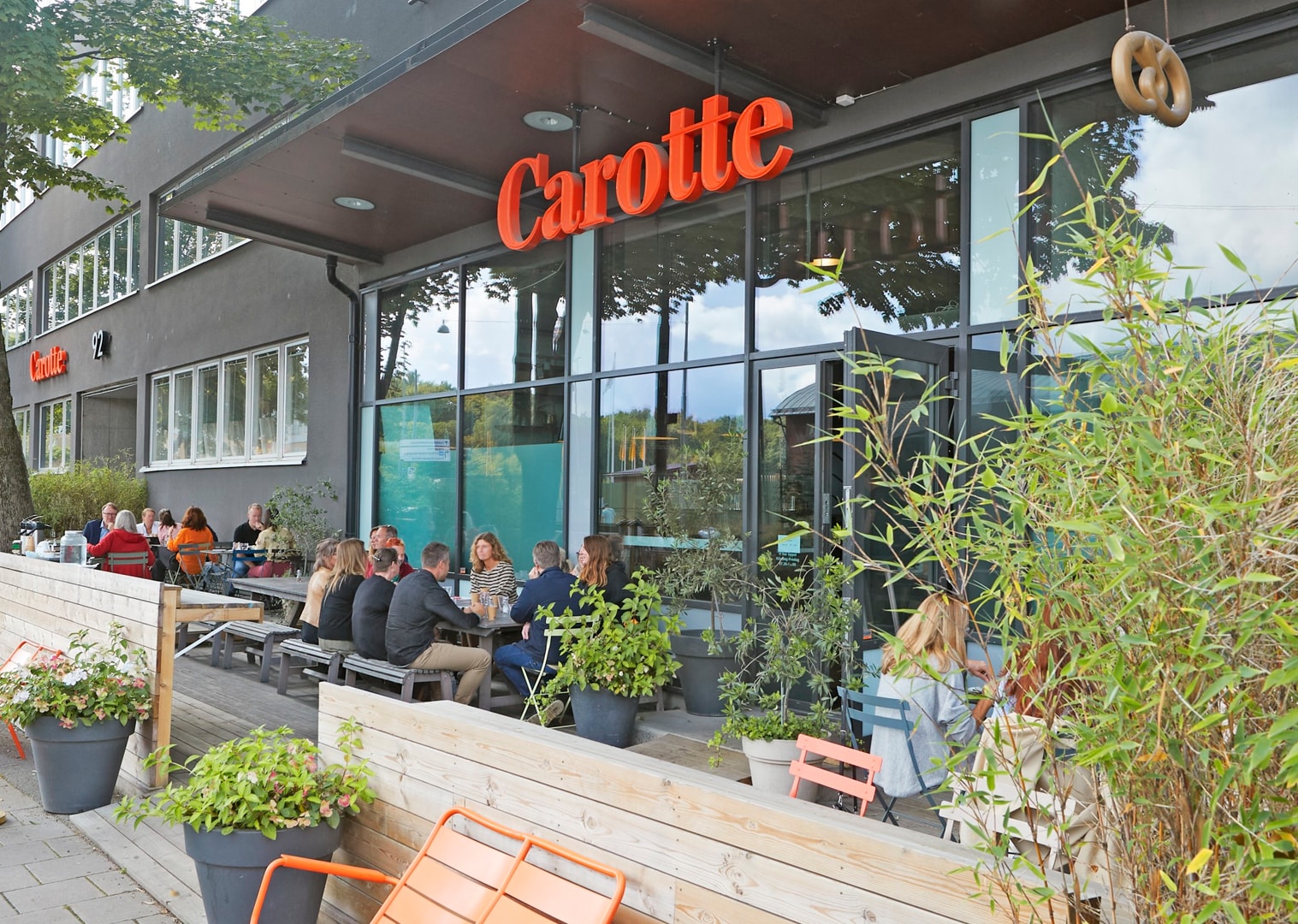 Precis utanför entrén breder ett charmigt, grönskande torg ut sig – en naturlig mötesplats med gemensamma sittbänkar i soligt läge. Här kan du ta en kaffe i solen, hålla informella möten utomhus eller bara njuta av en stunds avkoppling mellan arbetsuppgifterna.