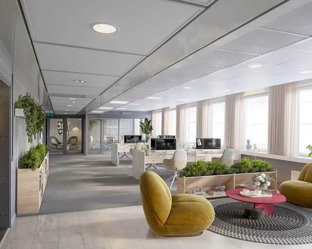 Planlösningen består av en öppen yta och ett flertal mötesrum.