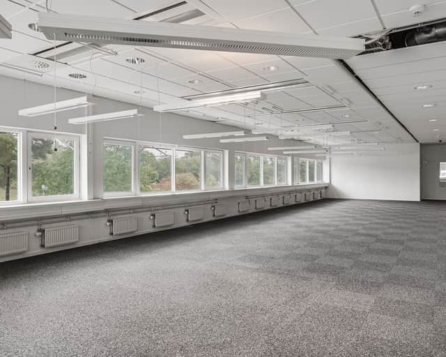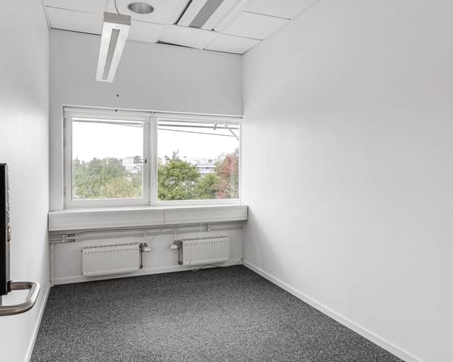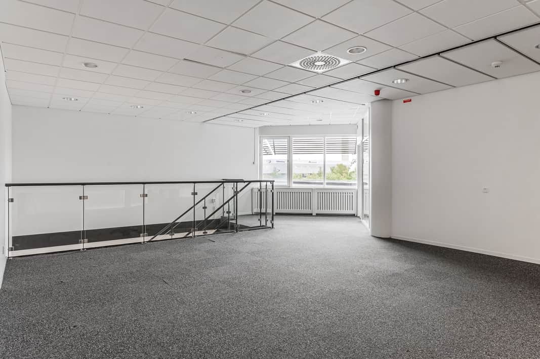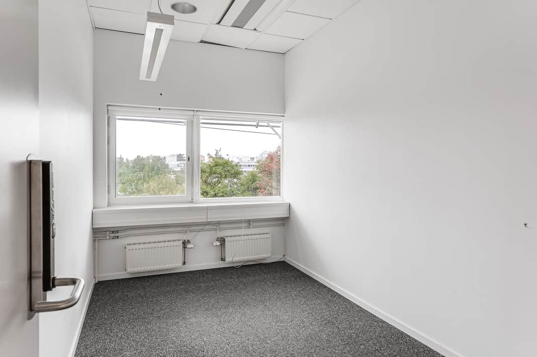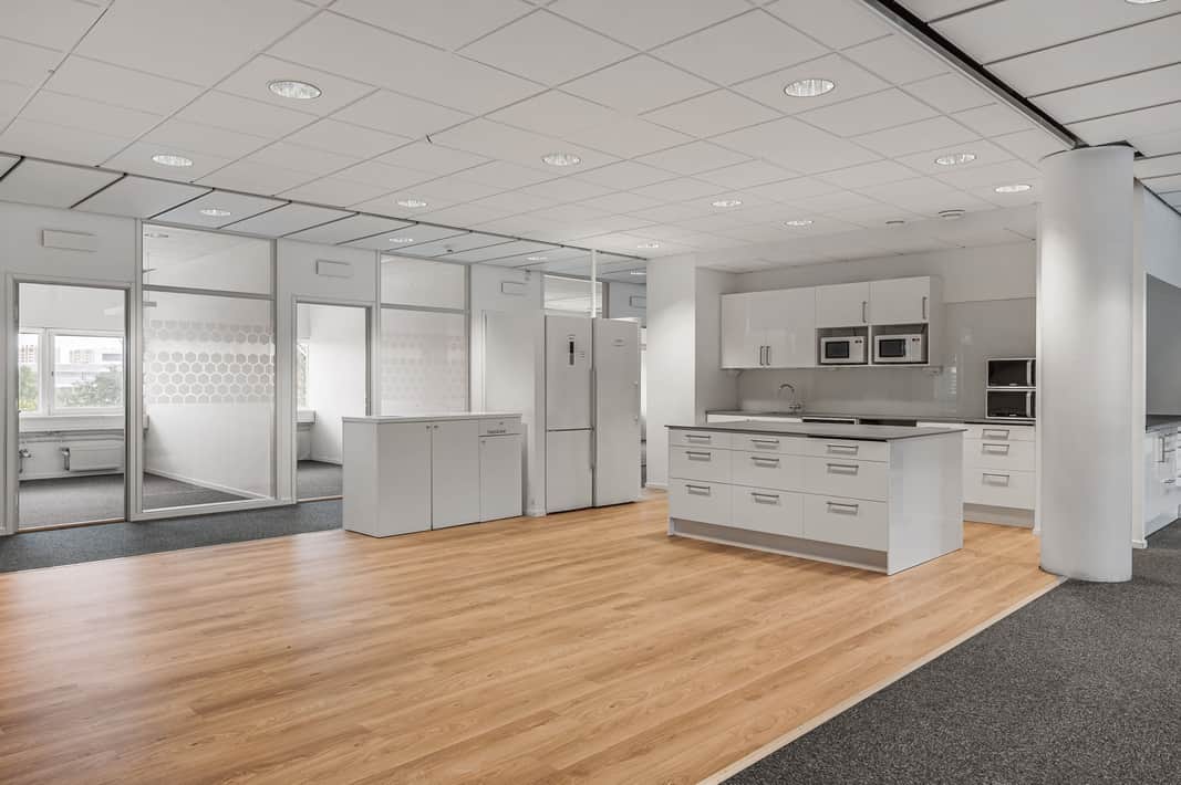 En trappa upp finns ett modernt och stilrent kontor med öppna ytor och ett par mötesrum.