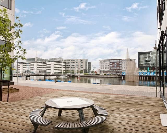 Precis utanför husknuten finns det bryggor och trevliga sittplatser där man kan äta sin lunch eller slappna av med en kopp kaffe.