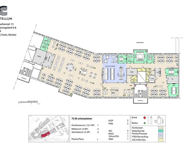 Planlösningen är tydligt zonindelad med god separation mellan arbetsplatser, mötesytor och servicefunktioner, vilket ger effektiva flöden och hög flexibilitet för olika typer av verksamheter.