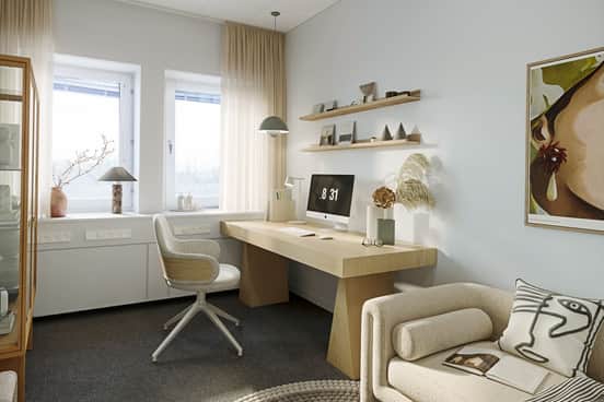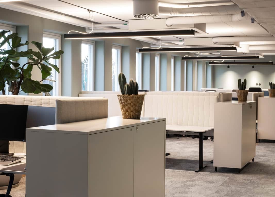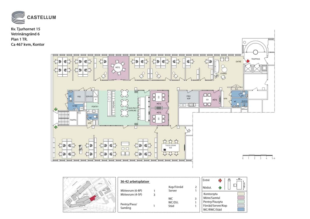 Planlösningen består av rumsindelade kontor och konferensrum med vikvägg i mittenkärnan som kan delas upp i två mindre konferensrum, pentry med loungedel, 2 st mindre samtalsrum och förrådsutrymmen med bra förvaringsmöjligheter.
