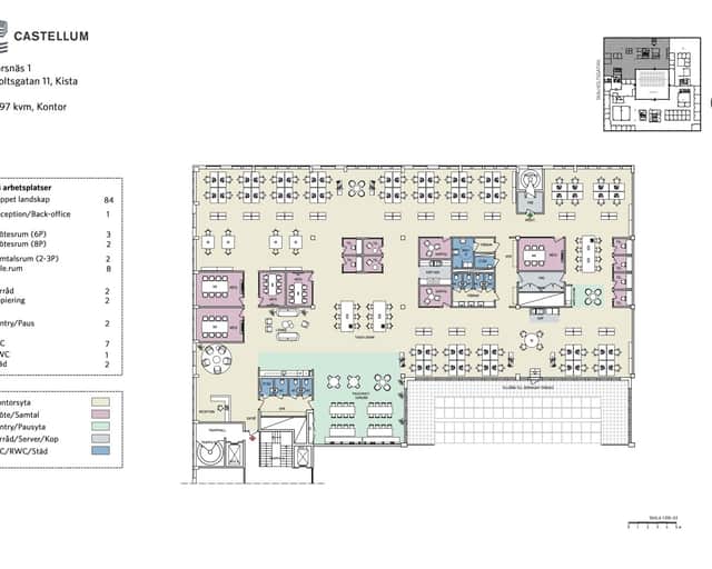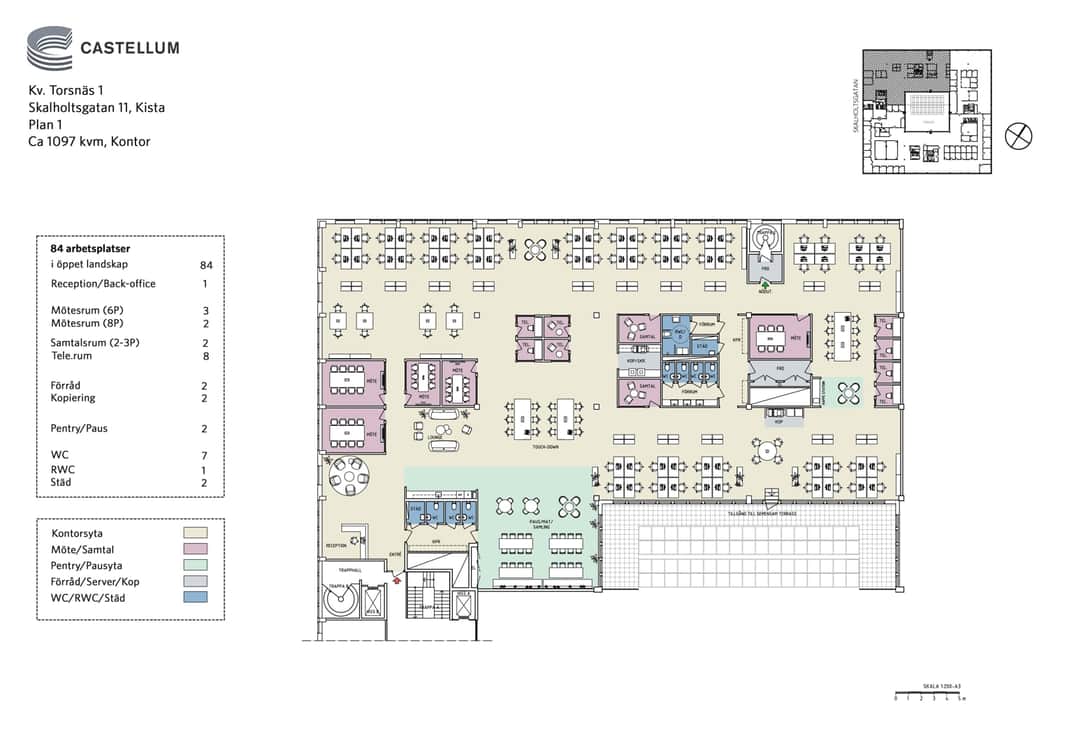Lokalen på Skalholtsgatan 11 omfattar ca 1 097 kvm (plan 1) och erbjuder en modern och effektiv kontorslösning med tydlig zonindelning. Huvuddelen av ytan utgörs av öppet kontorslandskap med totalt ca 84 arbetsplatser, kompletterat med touch-down-ytor för flexibelt arbete.