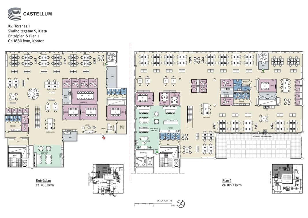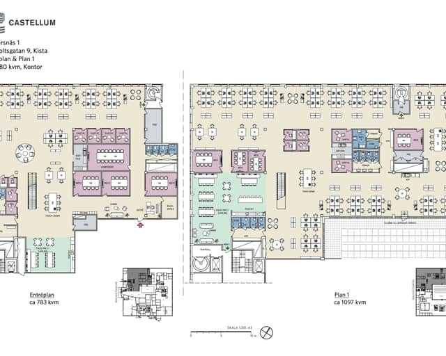 Lokalen omfattar ca 1 880 kvm fördelat på två plan (entréplan ca 783 kvm och plan 1 ca 1 097 kvm) med en modern och flexibel kontorsutformning. Stora öppna arbetsytor dominerar båda planen, med gott om plats för arbetsstationer och projekt-/teamytor.