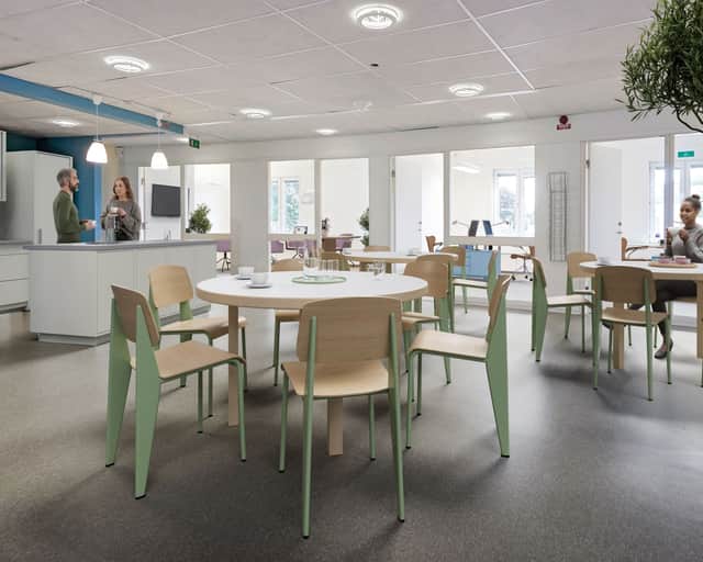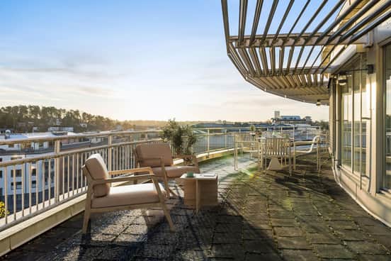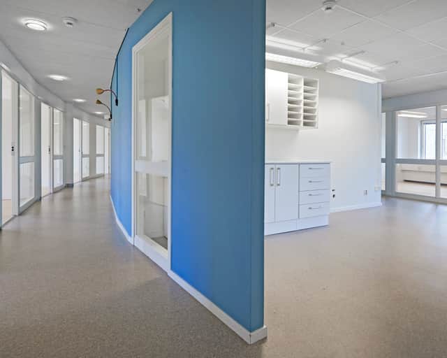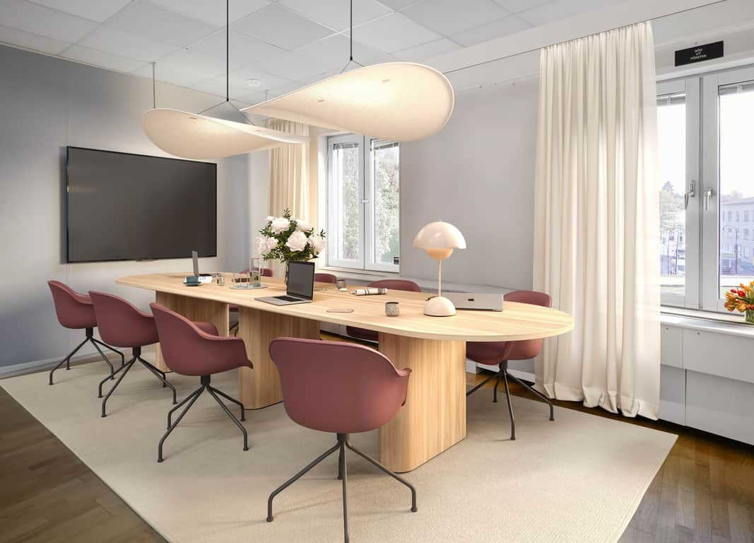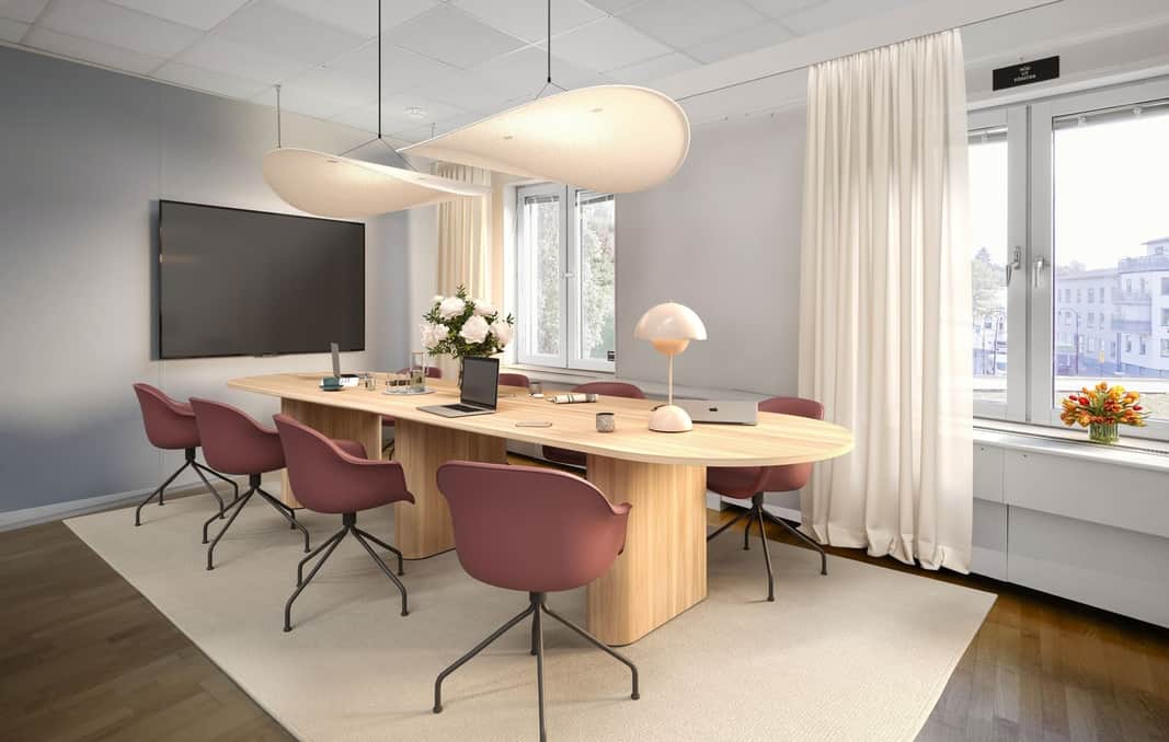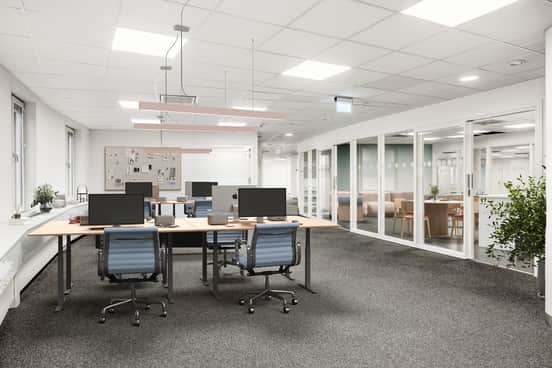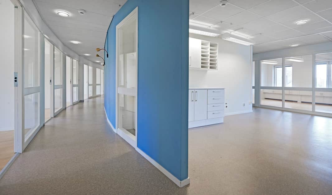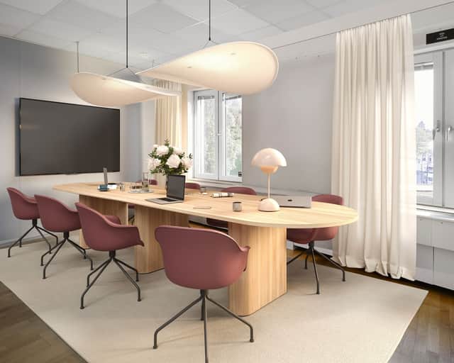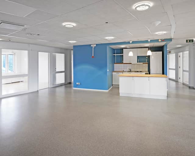 Planlösningen erbjuder både avskilda kontorsrum och generösa konferensrum. De vackra glasväggarna säkerställer att naturligt ljus flödar genom hela lokalen.