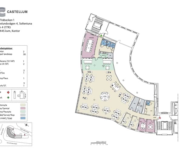 Servicefunktioner såsom förråd, serverrum, kopiering/post, WC samt dusch/städ är samlade nära entrén för effektiv logistik. Sammantaget erbjuder lokalen en välbalanserad planlösning med tydlig uppdelning mellan arbete, möten och sociala ytor, anpassad för cirka 32 arbetsplatser.