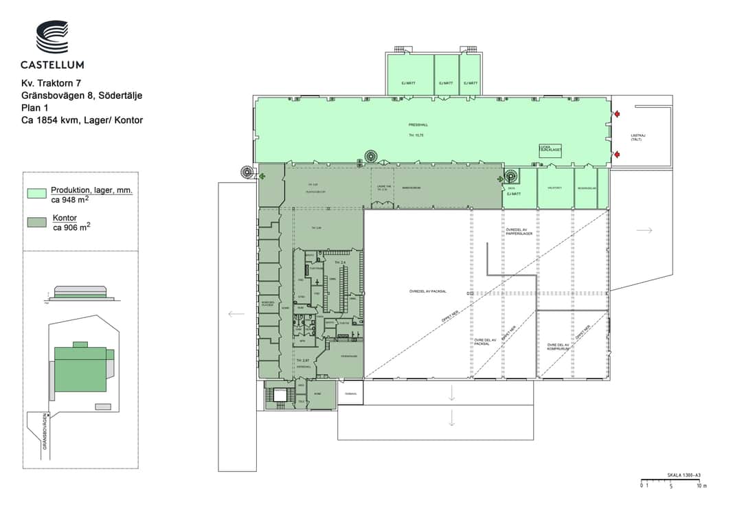 Enligt ritningen omfattar lokalen totalt ca 1 854 kvm fördelat på:
