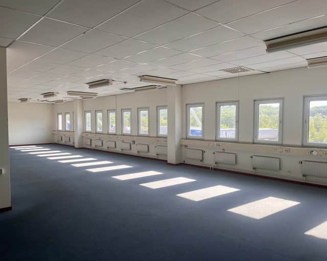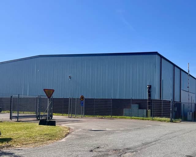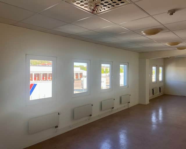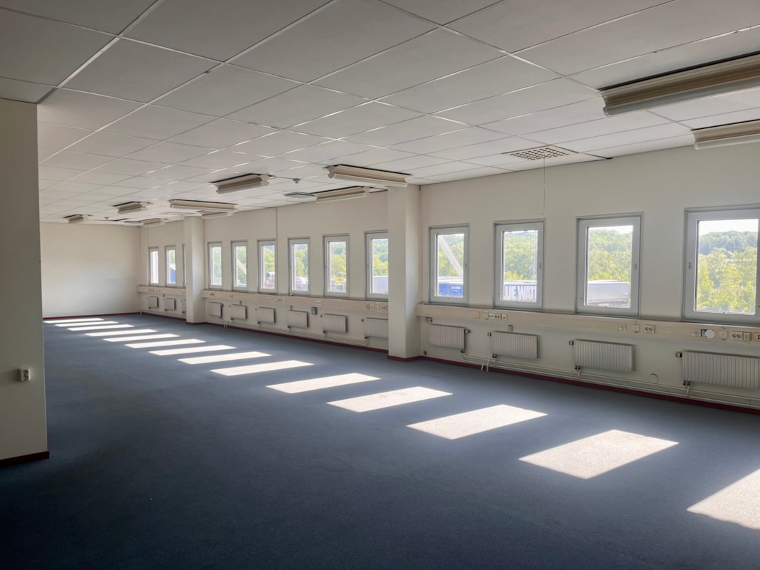 Stora lagerhall samt kontor, omklädningsrum med duschar. En port i markplan, uppställningsyta.