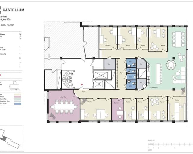 Planlösningen består av mötesrum för upp till 10 personer, pentry/pausyta, och ett antal enskilda kontorsrum samt öppna kontorsytor. Här finns totalt 14 arbetsplatser i egna rum och 5 arbetsplatser i en storrumslösning.