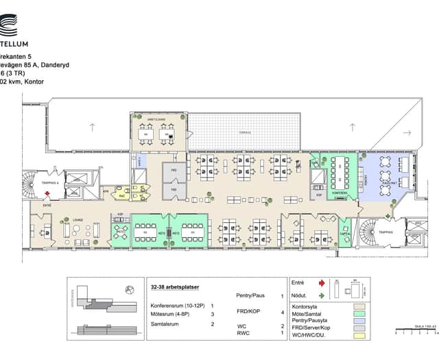 Planlösningen består av ett öppet kontorslandskap med arbetsplatser och mötesrum. Längs ena sidan finns arbetslounge och terrass, och till höger ligger konferensrum samt pentry med paus- och matplats.
