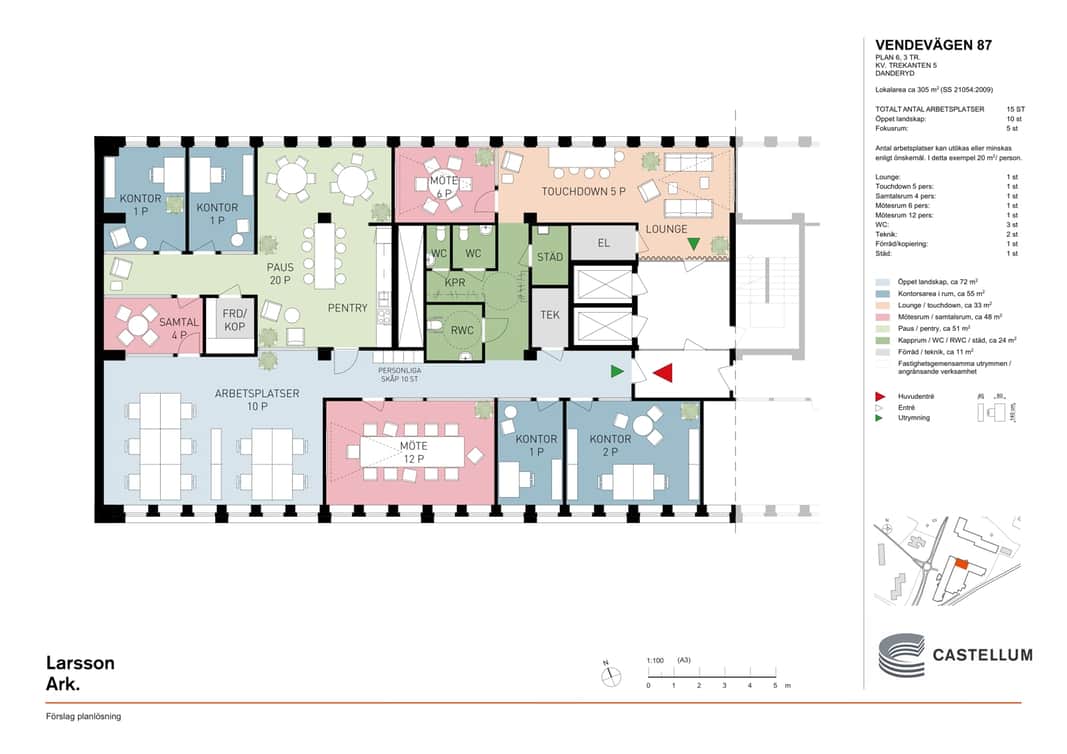 Detta är en modern fastighet som prioriterar medarbetarnas hälsa, välbefinnande och erbjuder en inspirerande arbetsmiljö. Här finns det utrymme för gemenskap, fysisk aktivitet, kreativitet och fokus. Byggnaden är utformad för att skapa en balans mellan arbetsliv och hälsa, med en rad faciliteter och tjänster som stödjer detta mål. Fastigheten har en total yta på cirka 1728 m² med flexibla kontorsutrymmen som kan anpassas efter era behov.