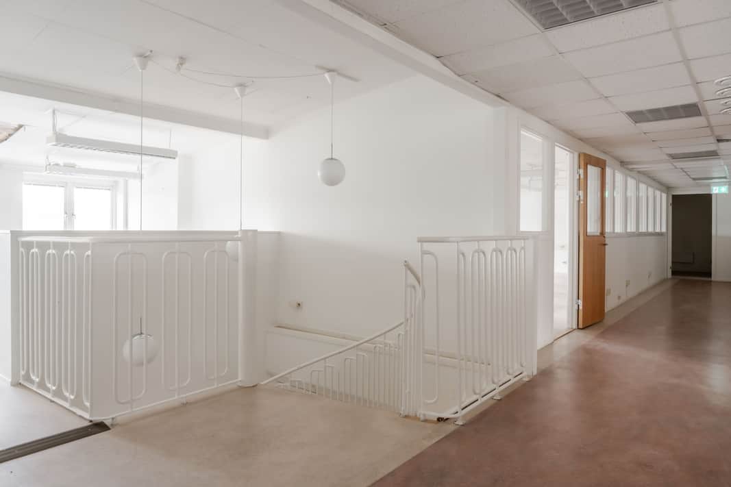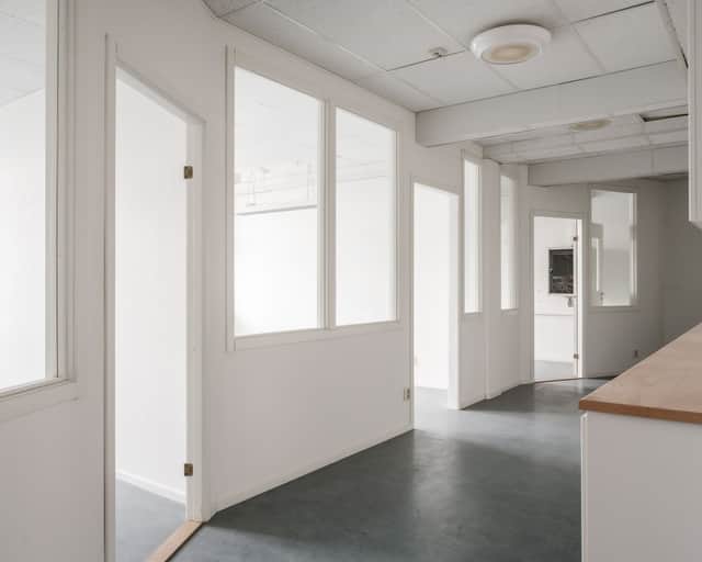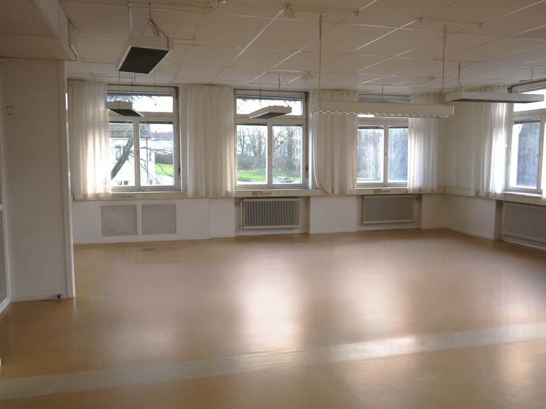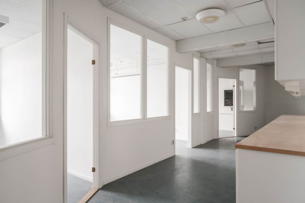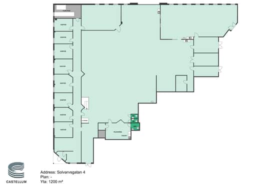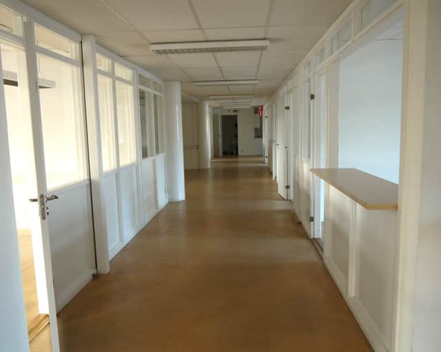 Flertal kontorsrum med plats för en person men även kontorsrum för flera personer, flertal wc, pausrum med pentry. Rum med mycket ljusinsläpp.