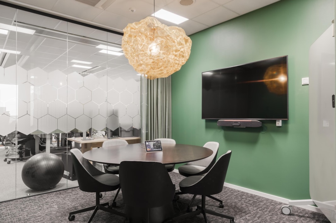 Lokalen är smart planerad för att möta behoven hos det moderna kontorslivet. Här samsas öppna kontorsytor med flera konferensrum i varierande storlekar – från mindre samtalsrum för en person till större mötesrum som rymmer upp till 14 deltagare. Det skapar flexibilitet för både fokuserat arbete och kreativa samarbeten.
