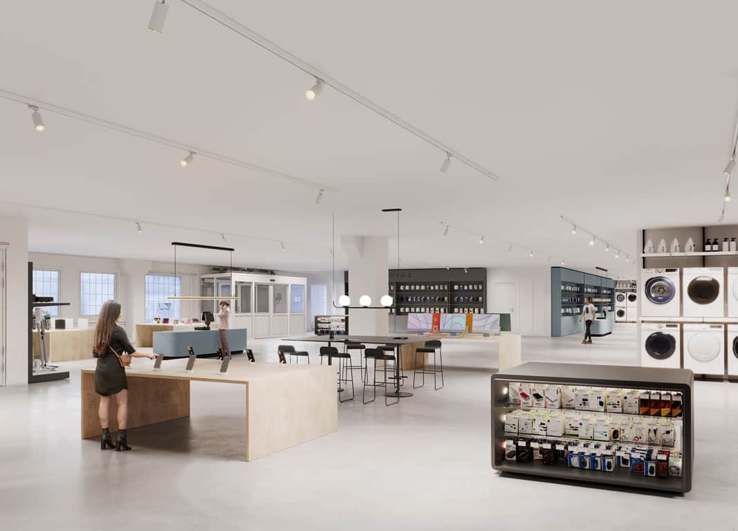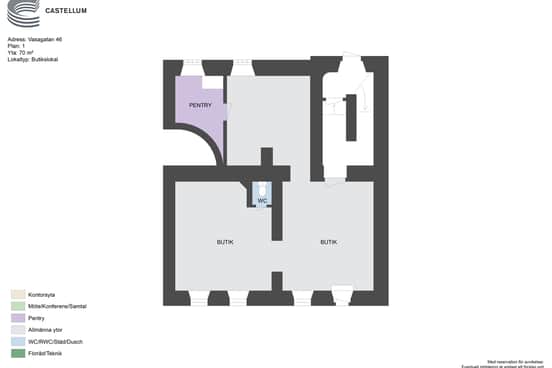 Lokalen erbjuder en flexibel planlösning med en stor öppen yta som passar för både butik och lager. Utöver detta finns kontor, en praktisk lastkaj samt personalutrymme med omklädningsrum.
