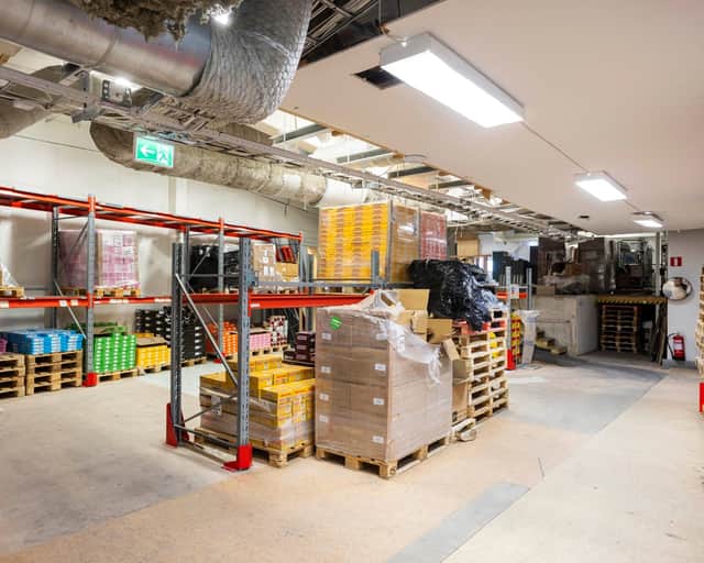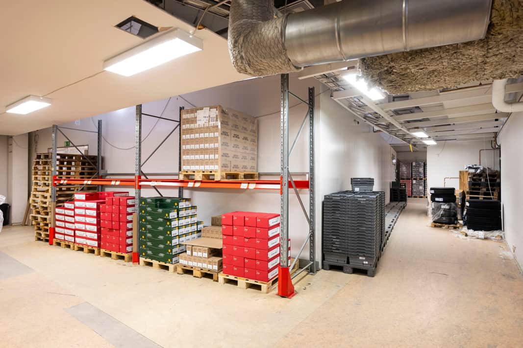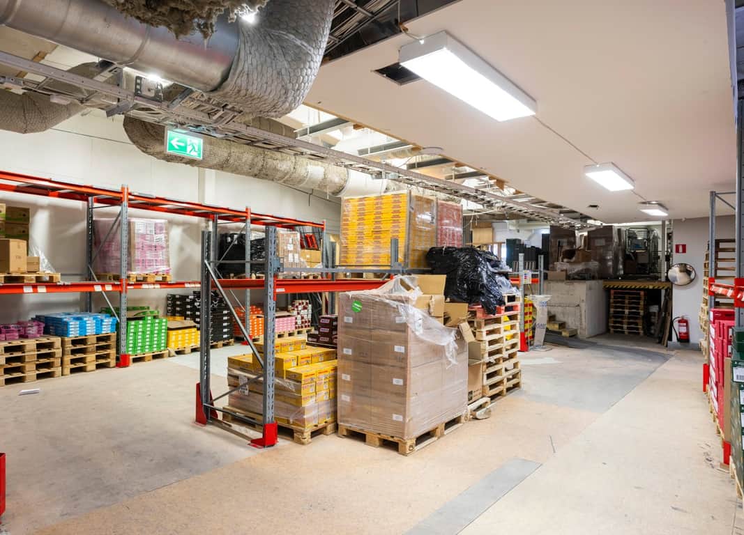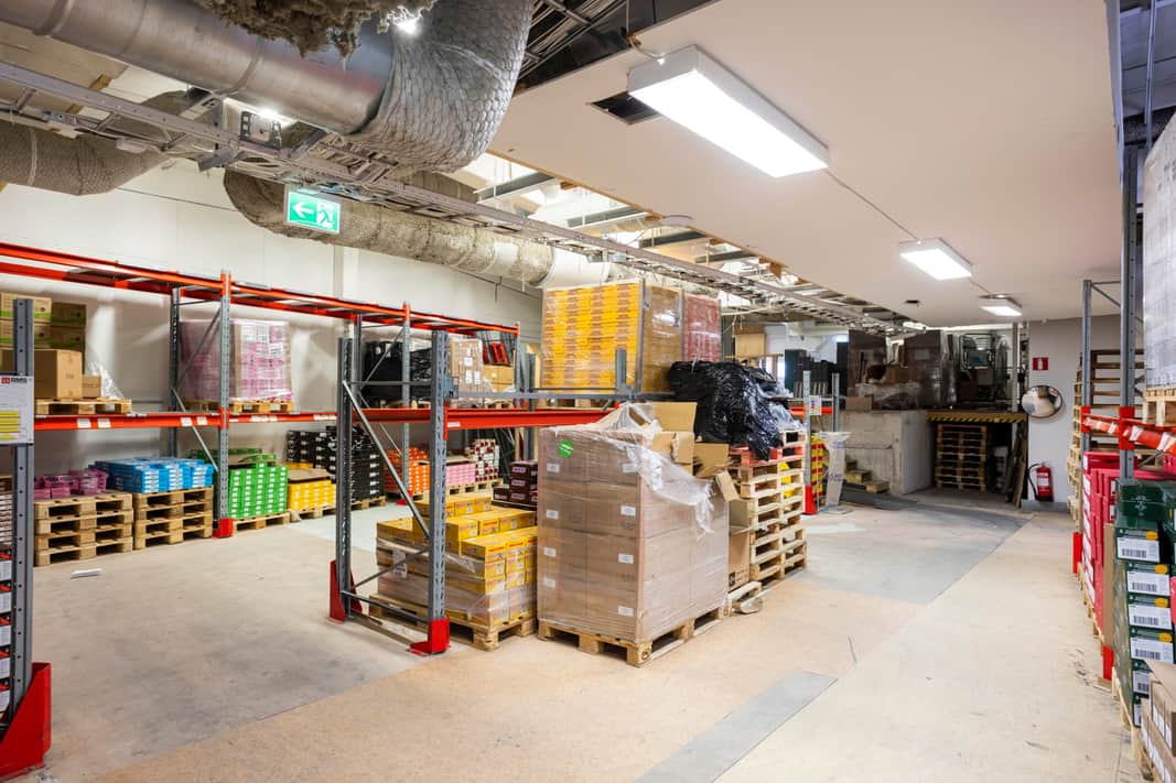 Entréplanet domineras av generösa lagerutrymmen med flera separata lagerytor som möjliggör flexibel hantering av varuflöden. Här finns även flera kylrum samt direkt anslutning till lastkaj via sluss, vilket skapar en smidig och effektiv logistiklösning. I anslutning till lagret finns även kompletterande funktioner som förråd, teknikutrymmen och personalytor såsom pentry och pausutrymmen. Ett showroom och enklare kontorsrum finns också på detta plan, vilket möjliggör kundbesök nära verksamheten.