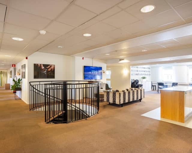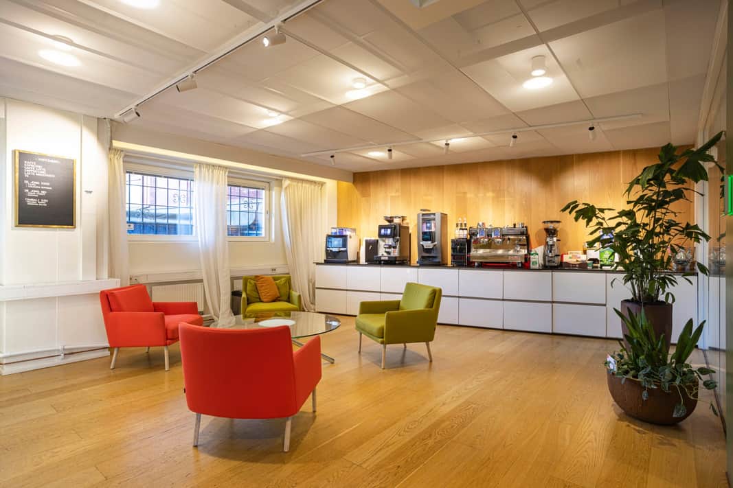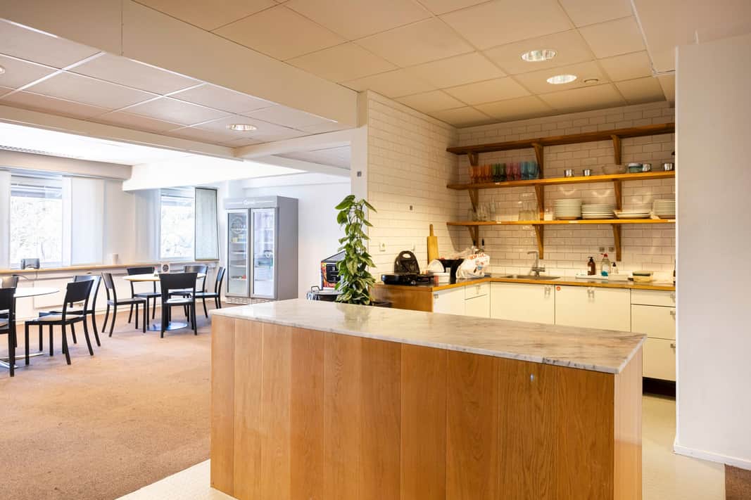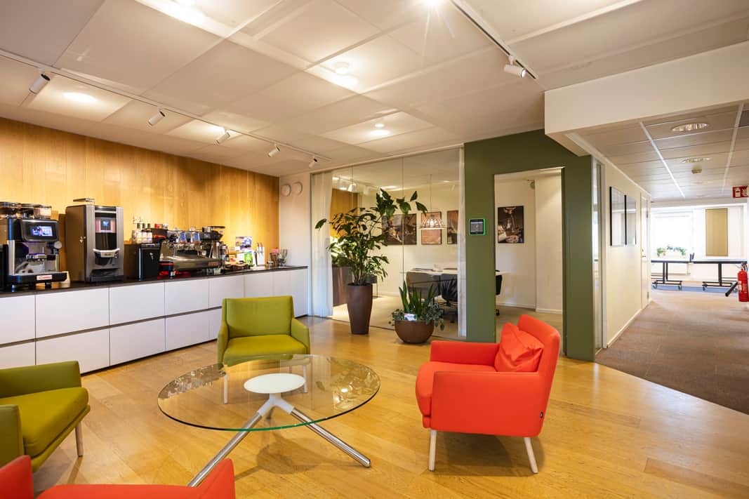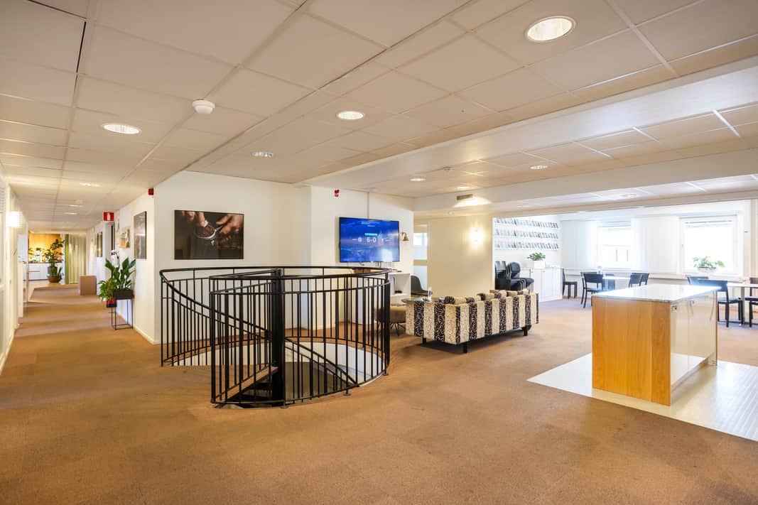 Kontorsdelen är modern och funktionell med flera mötesrum, tysta rum och trevliga pausytor inklusive kaffebar – idealiskt för både fokusarbete och samarbete. En inbjudande reception samt showroom skapar goda möjligheter för kundmöten och representation.