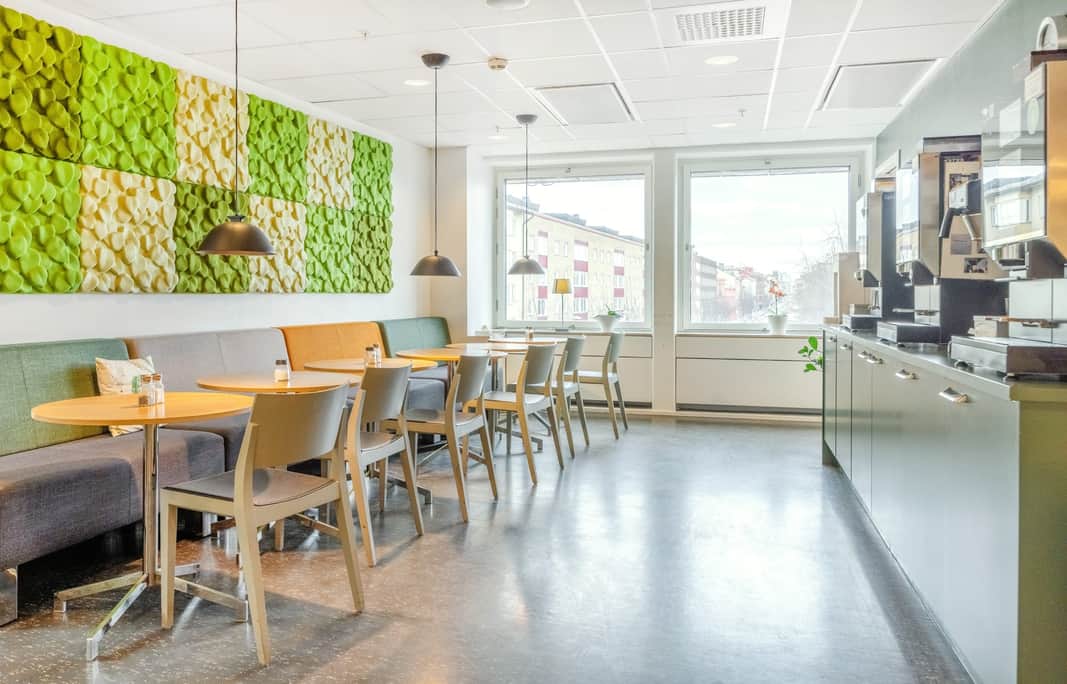 Lokalen erbjuder idag en öppen planlösning avgränsade i mindre enheter samt gott om samtalsrum och mötesrum.