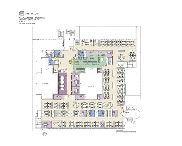 Denna kontorslokal om cirka 1 629 kvm erbjuder en rymlig och välstrukturerad planlösning med tydliga zoner för samarbete, fokusarbete och sociala ytor. Längs fasaderna löper stora öppna kontorslandskap med plats för många arbetsplatser och ett generöst ljusinsläpp från de omfattande fönsterpartierna. Den öppna strukturen skapar god överblick och möjliggör effektiv teamindelning.