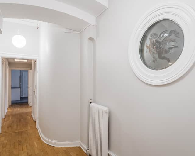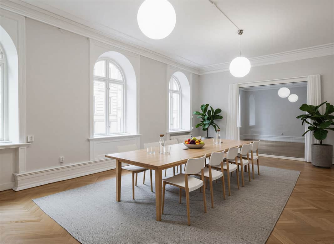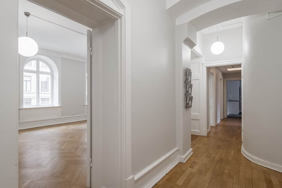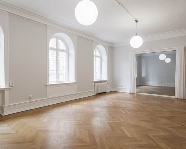 Den imponerande takhöjden ger inte bara en känsla av rymlighet utan skapar även en känsla av prestige och elegans. Unika detaljer såsom stuckatur ger en exklusiv atmosfär som sätter din verksamhet i en klass för sig. Beläget i ett anrikt hus med mycket historia.