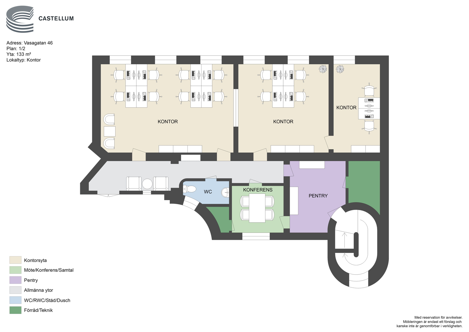 Planlösningen består av två stora flerpersonsrum och ett kontorsrum samt mötesrum/konferensrum, pentry, WC med dusch och förråd.
