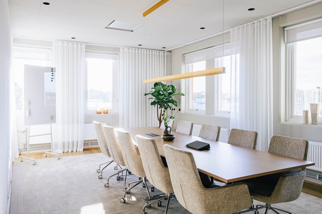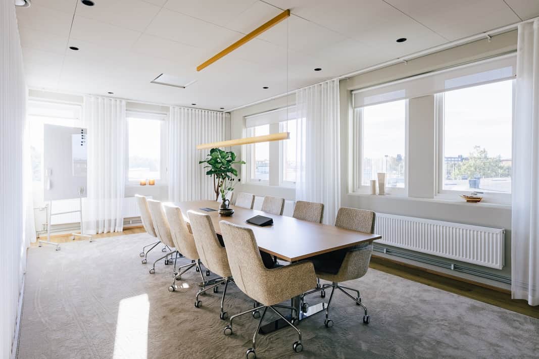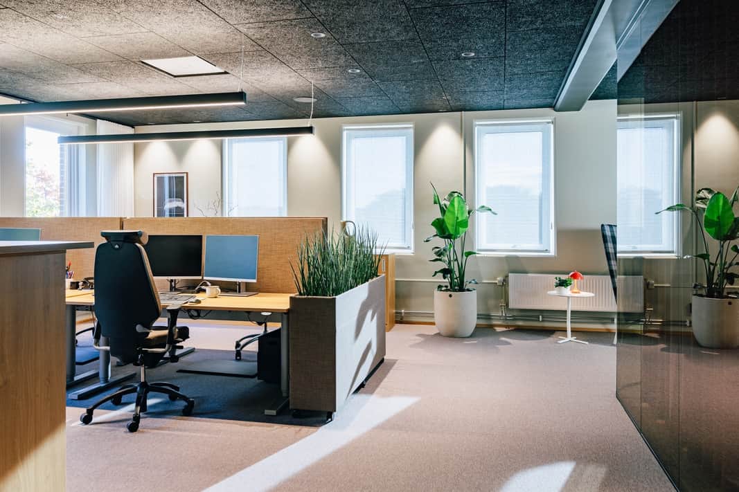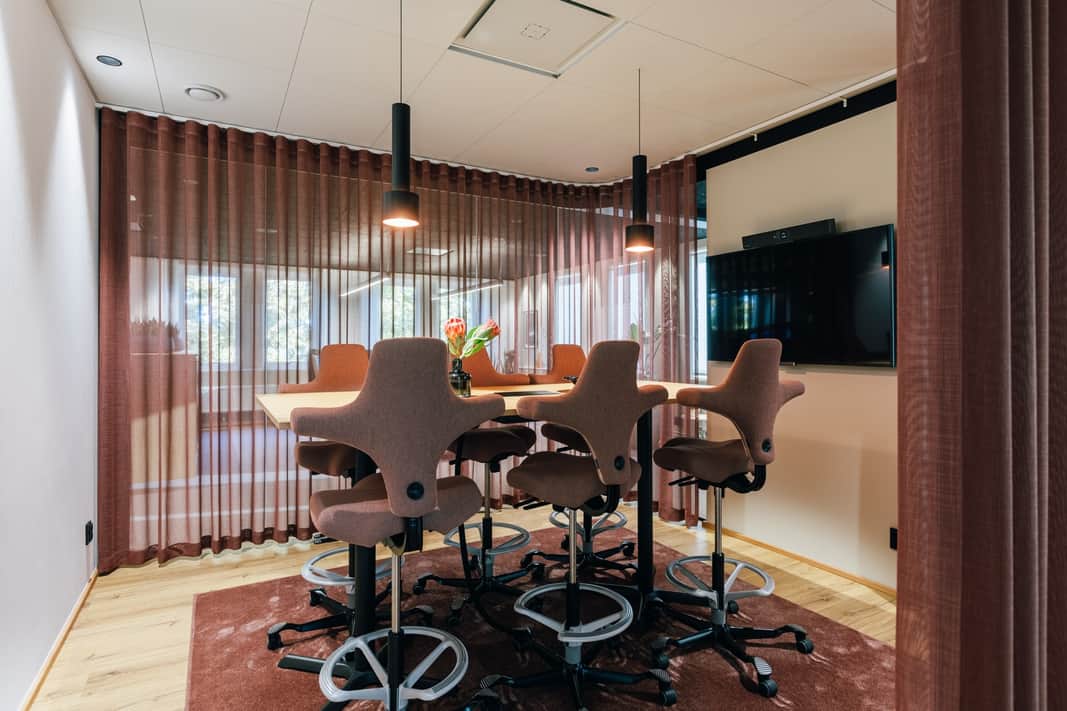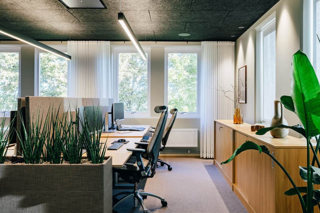 Kontoret bjuder på en fantastisk atmosfär tack vare generösa fönster i tre väderstreck. Den naturliga ljussättningen skapar en inspirerande arbetsmiljö som bidrar till både trivsel och produktivitet.