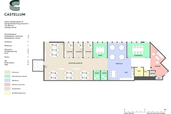 Bifogad planskiss är ett förslag på hur lokalen kan vara utformad. Vi anpassar planlösningen efter era behov och önskemål, men lokalen lämpar sig för en kombination av öppna kontorslandskap, projektytor och separata kontor eller mötesrum. Köket är placerat centralt i lokalen och skapar en naturlig mötesplats för medarbetare och besökare.