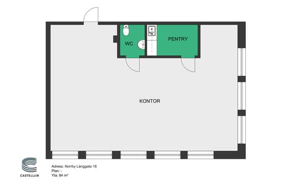 I dagsläget är lokalen rumsindelad. Det finns förrådsyta. pentry och två WC.