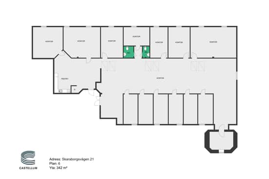 Lokalen erbjuder 12 kontorsrum där alla har ljusinsläpp från fönster och några av dem kan nyttjas för mötes då det finns bra med rymd. Flertal wc, städ, förrådsutrymmen, data -och projektrum.