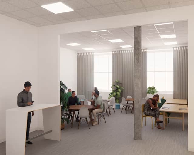 Entrén är öppen och rymlig, vilket ger möjlighet för en reception med väntrum eller för utställning om så önskas. Anpassningar görs med återbruk och hållbarthet i åtanke.