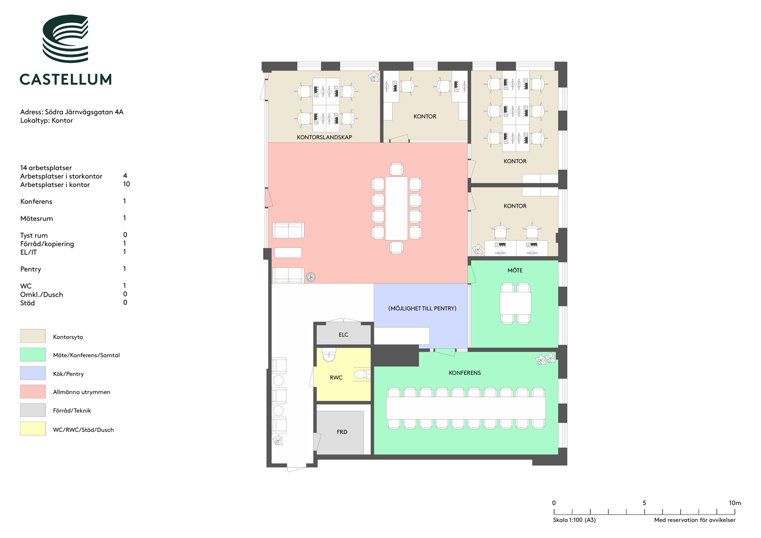 Lokalen är smart planerad för att möta olika behov och arbetssätt. Här finns fem mötes- och projektrum i varierande storlekar, vilket ger goda möjligheter till både kreativa workshops och fokuserade samtal. Två tillgänglighetsanpassade toaletter finns i lokalen, varav den ena är utrustad med dusch. Utöver detta finns även en vanlig wc, ett städrum samt två förråd och ett kapprum.