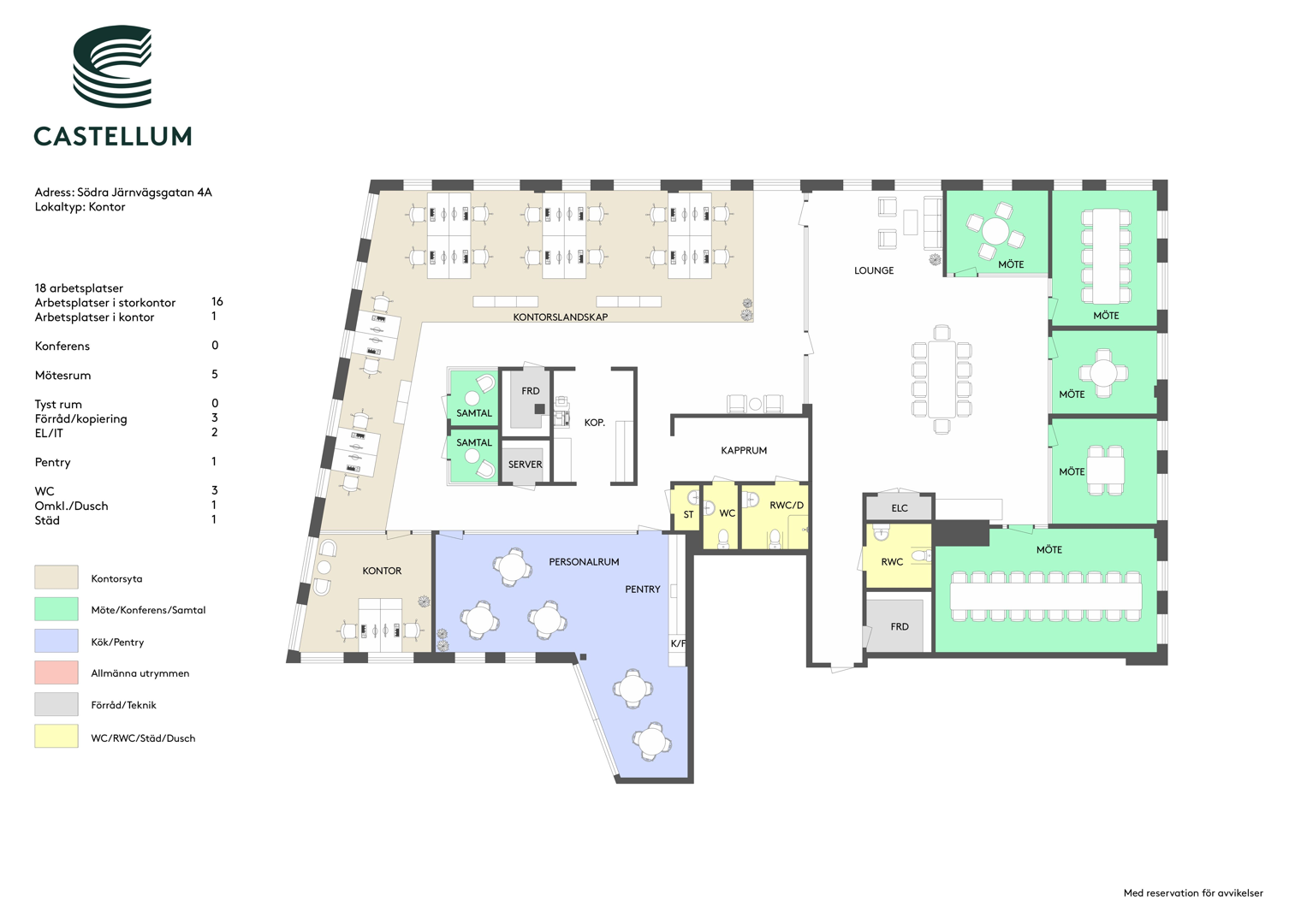 Lokalen är smart planerad för att möta olika behov och arbetssätt. Här finns fem mötes- och projektrum i varierande storlekar, vilket ger goda möjligheter till både kreativa workshops och fokuserade samtal. Två tillgänglighetsanpassade toaletter finns i lokalen, varav den ena är utrustad med dusch. Utöver detta finns även en vanlig wc, ett städrum samt två förråd och ett kapprum.
