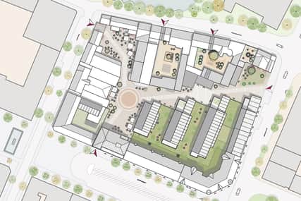 En portik i byggnaden blir en naturlig gångpassage som leder in till den nya gården och torget. Detta nya torg kommer att knytas samman med den befintliga passagen till Stallbacken och förmedla samma mysiga känsla av liv och rörelse, med caféer, butiker och människor i rörelse.
