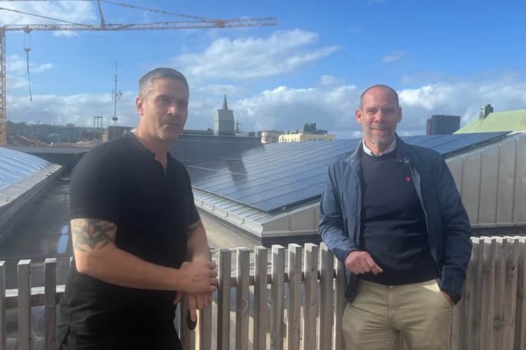Här i Jönköping har vi installerat solcellsanläggningar på flera av våra fastigheter, bland annat på taket till mötesplatsen Werket. Det vi dessutom har lyckats göra här är att dela solenergin, från Werket till Polishuset. Det tack vare ett internt mikronät.