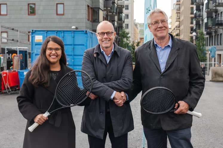 Byggstarten av kontorsprojektet Infinity firades med ett symboliskt tennisslag av Jan Valeskog (S), stadsbyggnads- och idrottsborgarråd i Stockholms stad och Sara Kukka-Salam (S), kommunstyrelsens ordförande i Solna