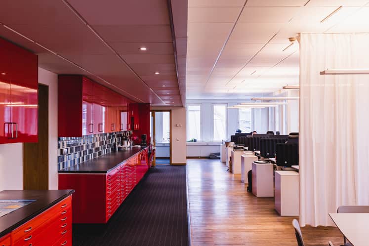 "Vi tror det var några arkitekter som satt här innan och de har verkligen skapat något speciellt. Det är som ett gigantiskt kök och stora öppna ytor för arbetsplatser."